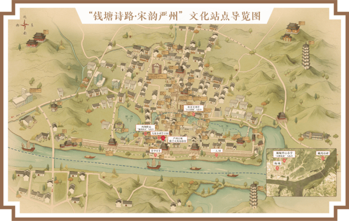 严州古城数字文化体验馆,以严州历史文化和历代诗词为元素,基于严州“人、地、时、物、诗”等数据,形成包括钱塘江诗路地图、严州古城诗路图谱、壮游严州数字图卷等数字展项。