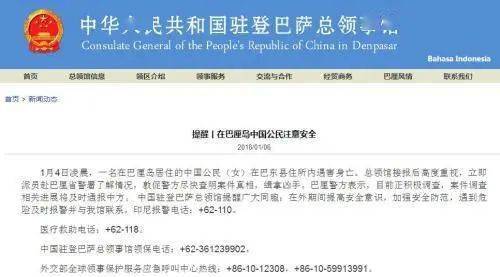 公告说,1月4日凌晨,一名在巴厘岛居住的中国公民(女)在其住所内遇害身亡。总领馆接报后高度重视,立即派员赴巴厘省警署了解情况,敦促警方尽快查明案件真相,缉拿凶手。