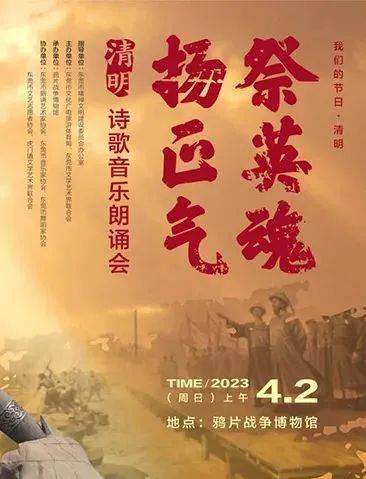 活动简介:以“祭英魂·扬正气”为名,在鸦片战争博物馆林则徐铜像前举办一场清明诗歌音乐朗诵会。 活动将分为祭英魂、扬正气、承精神三个篇章,将邀请东莞市诗人作家、艺术家、相关艺术团队参与,用诗歌、音乐致敬和缅怀民族英雄林则徐虎门销烟之壮举,弘扬伟大爱国主义精神。