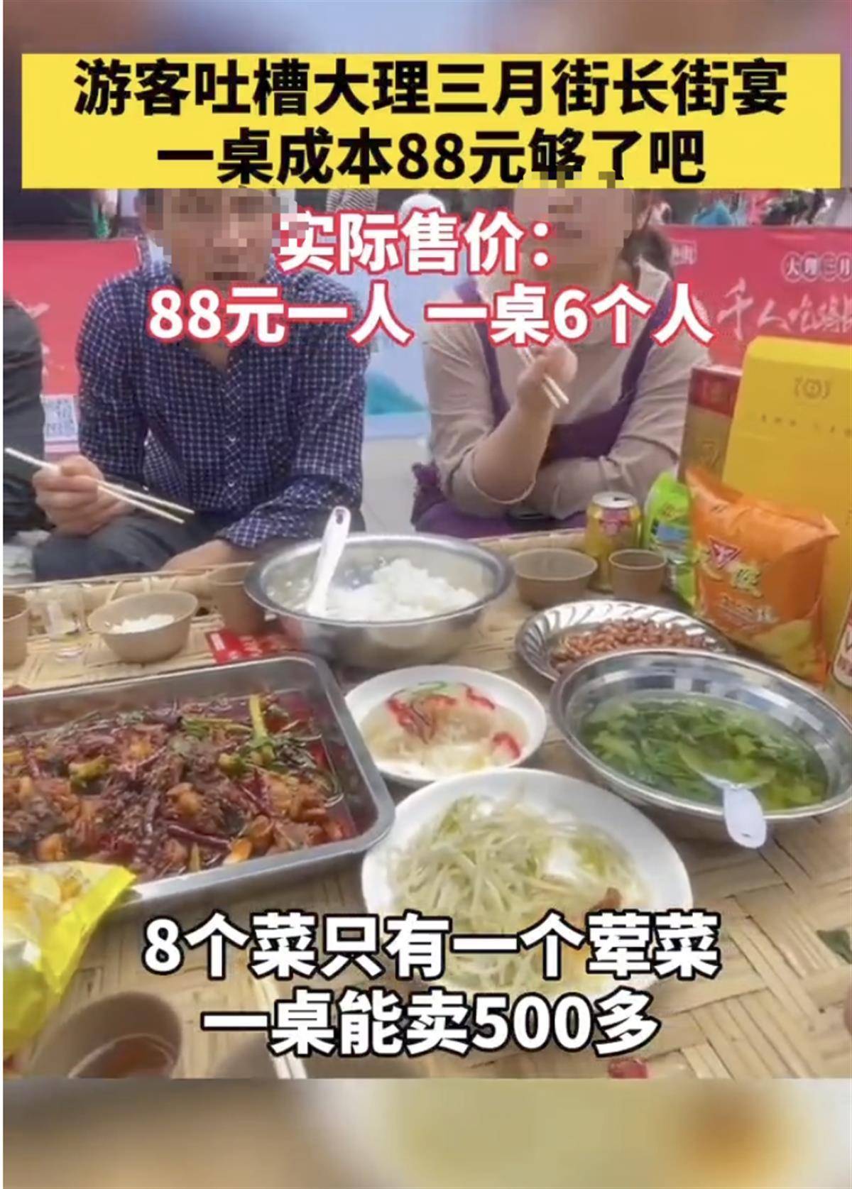 5月4日,有游客在云南大理体验三月街长街宴时,吐槽菜品定价高。该游客在镜头前称,一桌共8个菜只有一个荤菜,一桌6个人,每人收费88元,一桌卖五百多元,而成本估计只有88元。