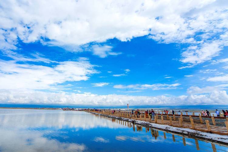 3、茶卡盐湖临近青海湖,几乎所有到青海湖旅游的朋友都会去到茶卡盐湖。这里是中国版“天空之境”,这里纯净自然如诗如画,这里是是摄影爱好者的天堂。如镜面般的湖水通透到让人分不清天与湖。湖水很浅,洁白的盐粒铺满了湖底,进入湖中,埋头往里走,寻一个人少的地方,拍摄一组天地同景的大片吧!
