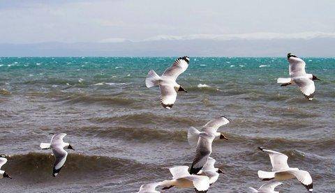 近处,成群的鸥鸟在水中嬉戏,不时有人向鸥鸟投喂食物。鸥鸟们也不争抢,仿佛谁都有份似的。