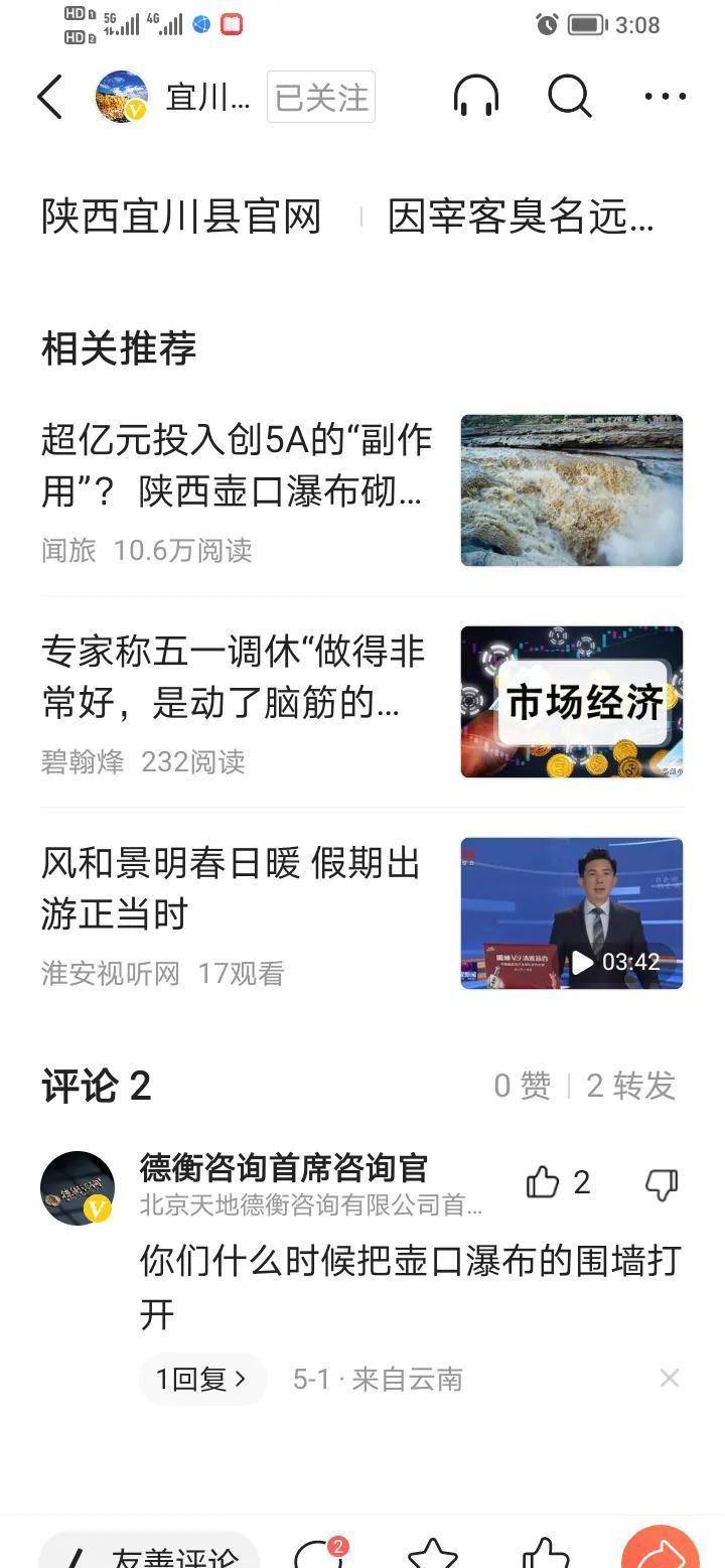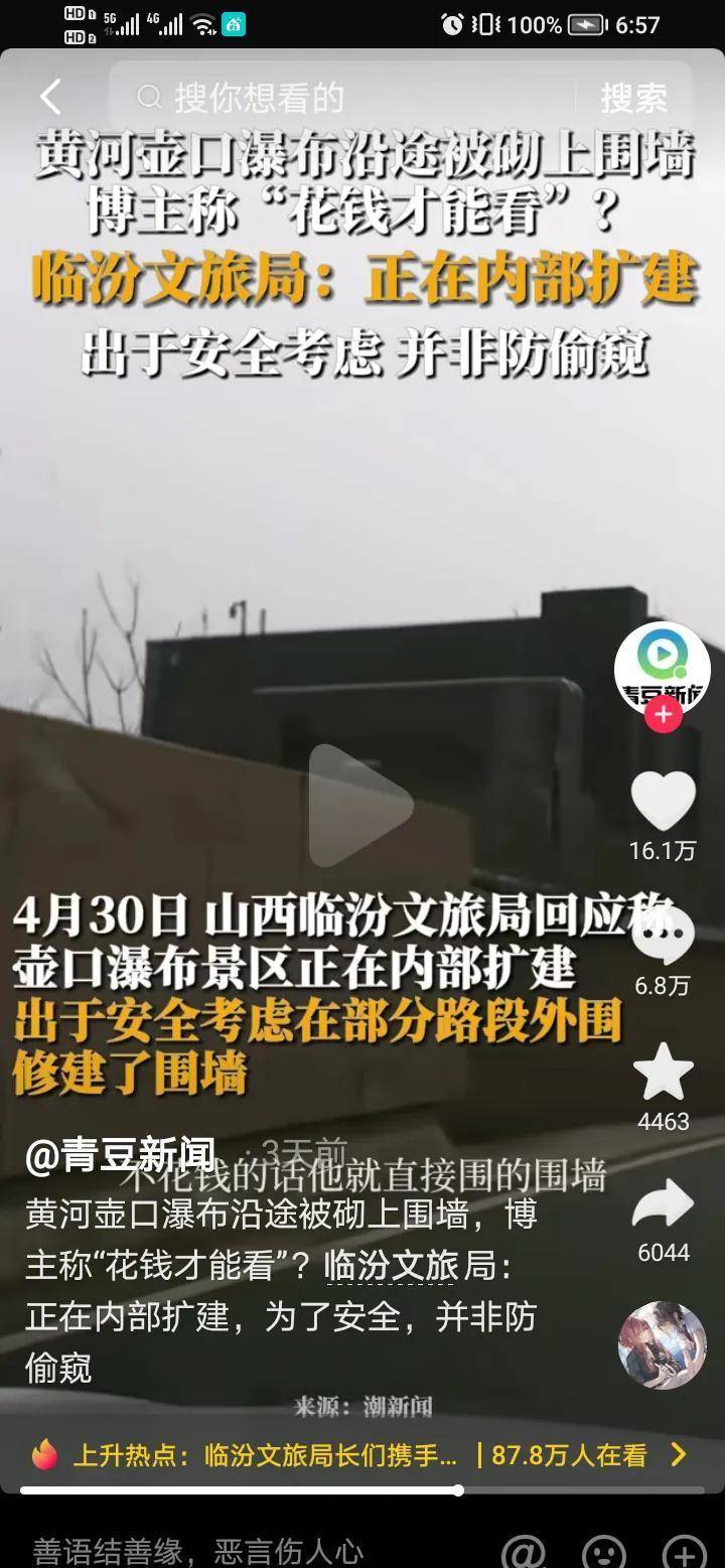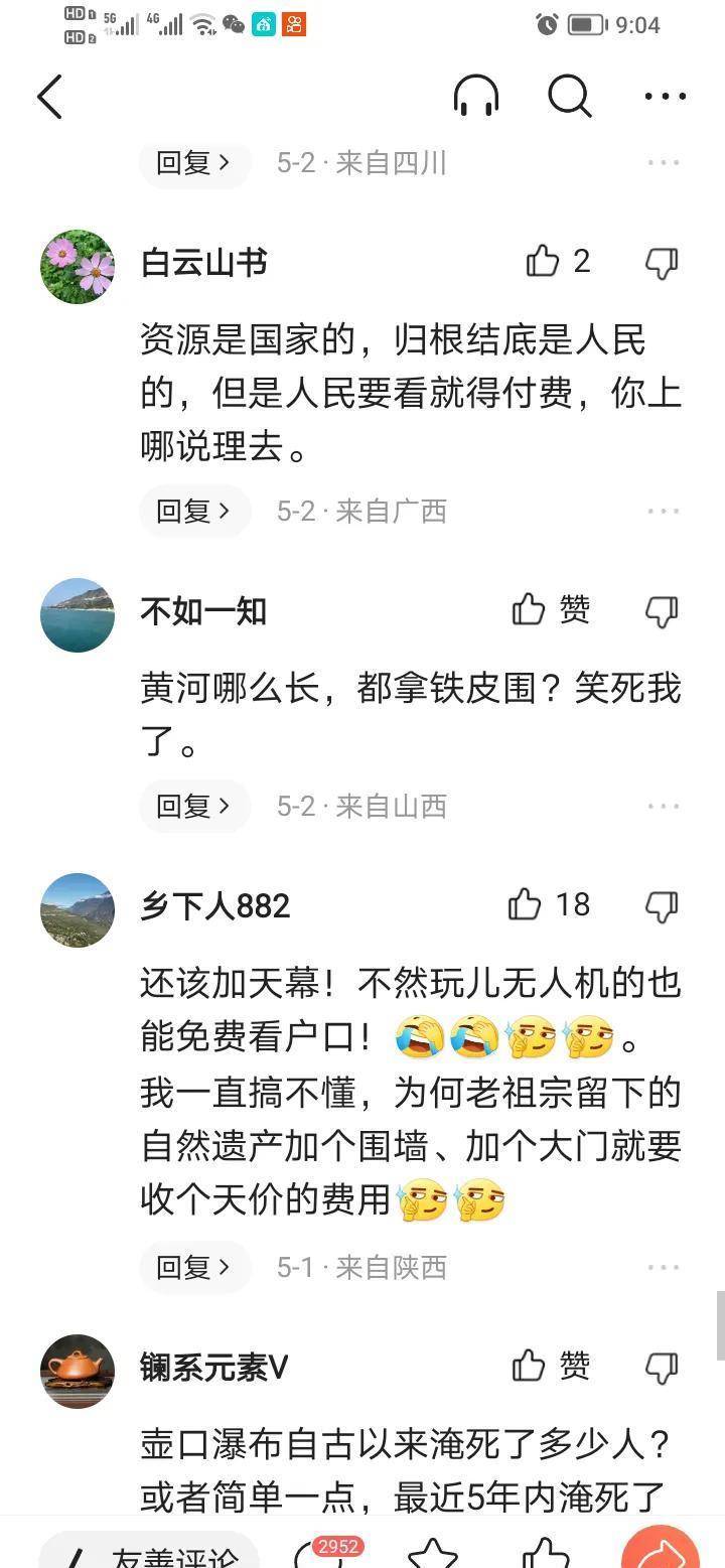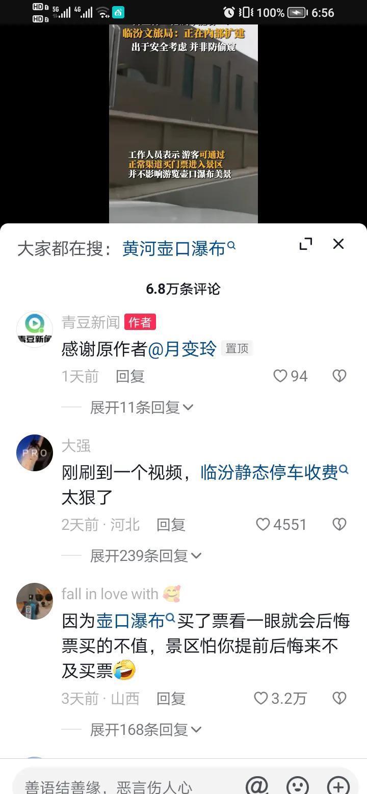 虽然我在异地,但我怀念故土,在五一黄金周,每个景区都想做明星景点标兵,就和山东淄博赶烤一样提高城市品牌,当我看到故土壶口瀑布围墙上了热搜,感到惊呀!网上贴文,抖音满天发,有的人语毒心险,骂政府不要脸,这一痛点,故土心痛。第一时间发贴交流旅游者的关注及需求。我们的旅游者到底需求什么?从贴文两千多评论,总出结果,就是让免费旅游,不该收费已议点。什么借题发挥;看看母亲也出钱,应该把黄帝陵门票也免了,地方格局太小。就是围钱。有的网友把地方特产也开始丑化,让人心呀!