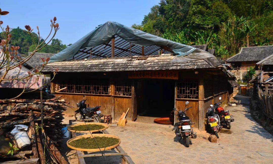 走进寨子里,只见眼前建筑多为两层栏杆式木头房子,家家户户大门敞开,门前晒着茶叶,看见我们路过,一位穿着民族服装的美女热情地招呼我们进去喝茶。