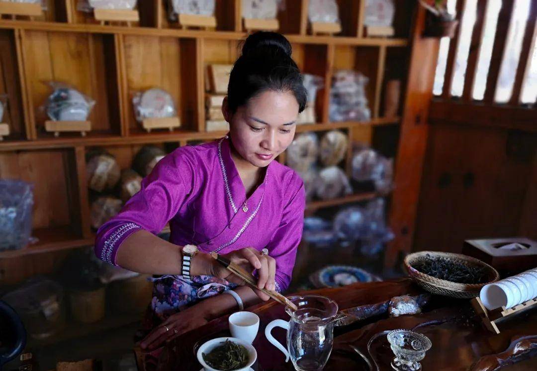 她是当地的傣族人,说着一口流利的汉语,她说糯干古寨家家户户都产茶、制茶,而她们家在当地是比较大的产茶商。边聊着天她边给我们泡茶,茶汤金黄清澈透明,香气扑鼻入口回甘。