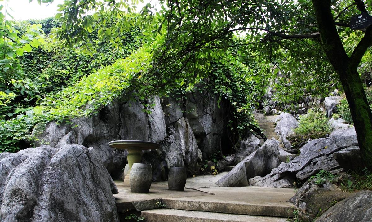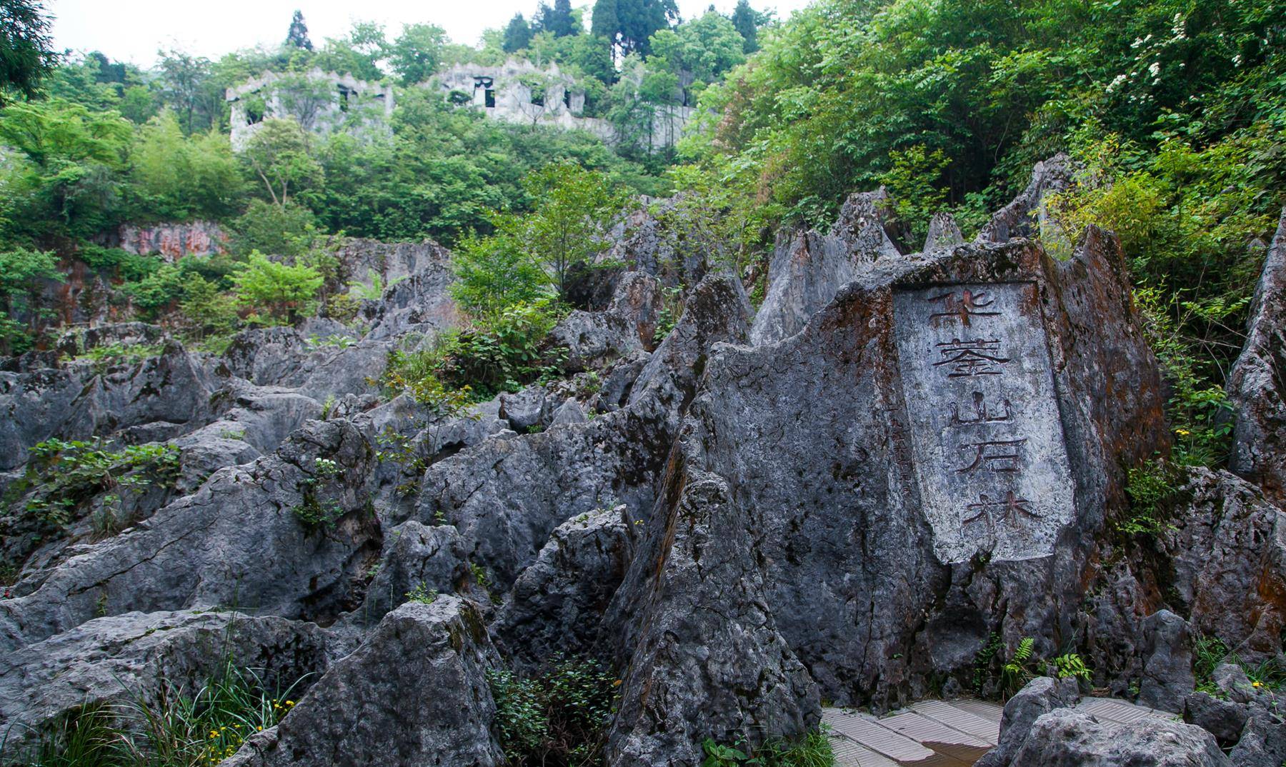 四川盆地广安市境内。是一个集石林地貌景观和红色教育意义为一体的综合景区。景区入口处是一个巨型红色雕塑,英姿飒爽的“双枪老太婆”。当年游击队活动的场所就是一个个溶洞里,保密有安全。