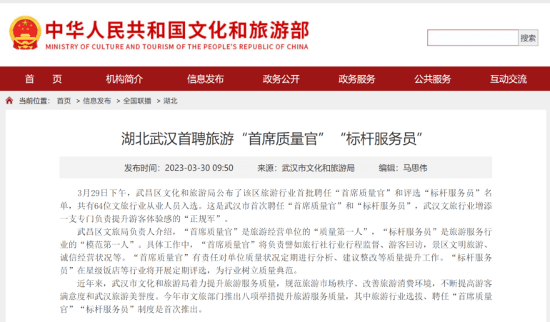 3月29日,湖北武汉首聘旅游“首席质量官”“标杆服务员”,为行业树立质量典范,规范旅游市场秩序、改善旅游消费环境。