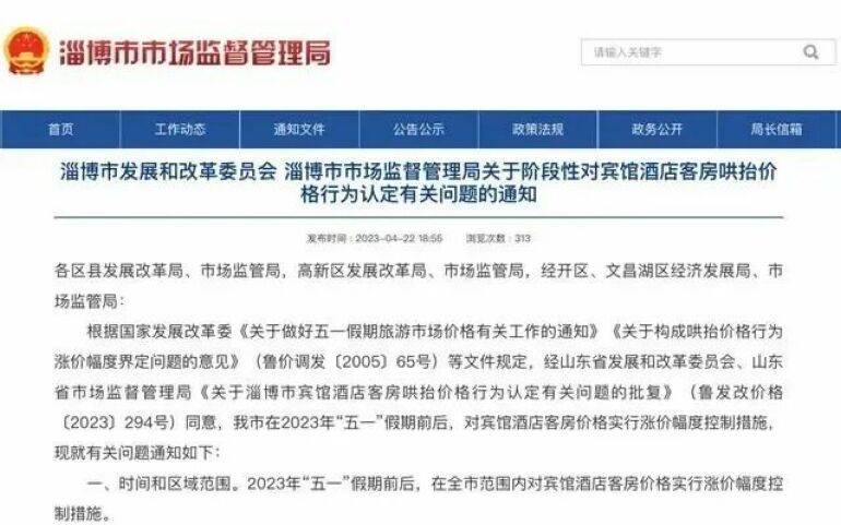 五一前夕,淄博市市场监督管理局发布通知,对宾馆酒店客房价格实行涨价幅度控制措施,按3月各类型客房平均成交价格计算,上浮超过50%的,按哄抬价格行为予以查处,淄博部分酒店纷纷出现“坐地降价”的一幕:有游客表示,自己预订了一晚1341元的酒店,后被通知只用付735元。