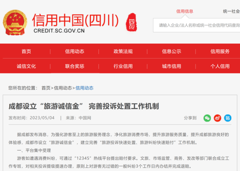 近日,成都发布消息,为强化游客至上的旅游服务理念,净化旅游消费市场,提升旅游服务质量,成都市区两级统筹设立“旅游诚信金”2000万元,建立涉旅投诉先行赔付机制,完善“旅游投诉快速处置、旅游纠纷快速赔付”工作机制。