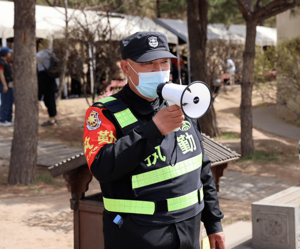 “五一”期间,除票务、讲解、停车等压力较大之外,安保工作也是重中之重。每天一大早,满载各地旅游团的大巴车和乘坐其他交通工具的散客就蜂拥而至,九点刚过已是人山人海。众多游客中,有很多是老人和孩子,如果都拥堵在洞窟门口,会造成极大的安全隐患。于是,安保工作人员在门口设置了一道安全警戒线,组织游客有序进入。面对洪峰一样的客流,大家高度关注安全秩序,时刻留意可能造成混乱的苗头,严防拥挤、踩踏等事件发生。今年除了原有的安保力量之外,云冈研究院还联合市、区相关部门增派力量,维持景区秩序平稳。