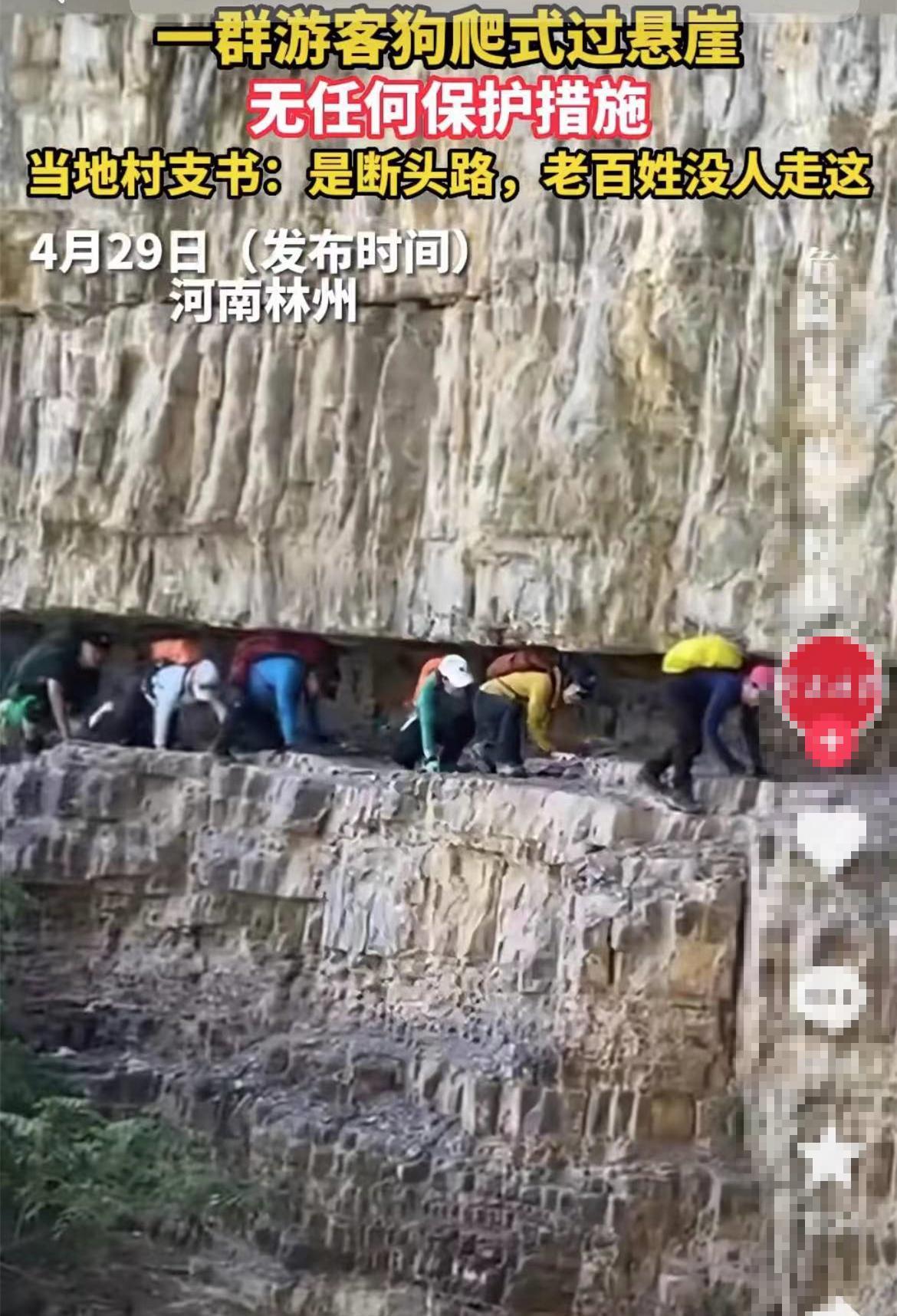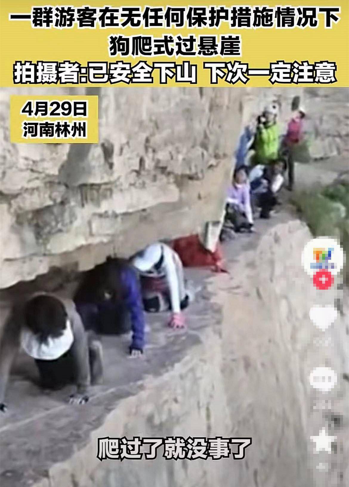 近日河南林州,一群来自上海的驴友在当地登山健身,来到一处山崖,中间只剩一条很窄的缝隙路,于是他们采用狗爬式的方法,跪爬着穿越悬崖,旁边是几十米的残垣断壁,没有防护栏,现场险象环生,相当危险,可胆大的一群人,竟无一人拉安全绳做安全保护措施。