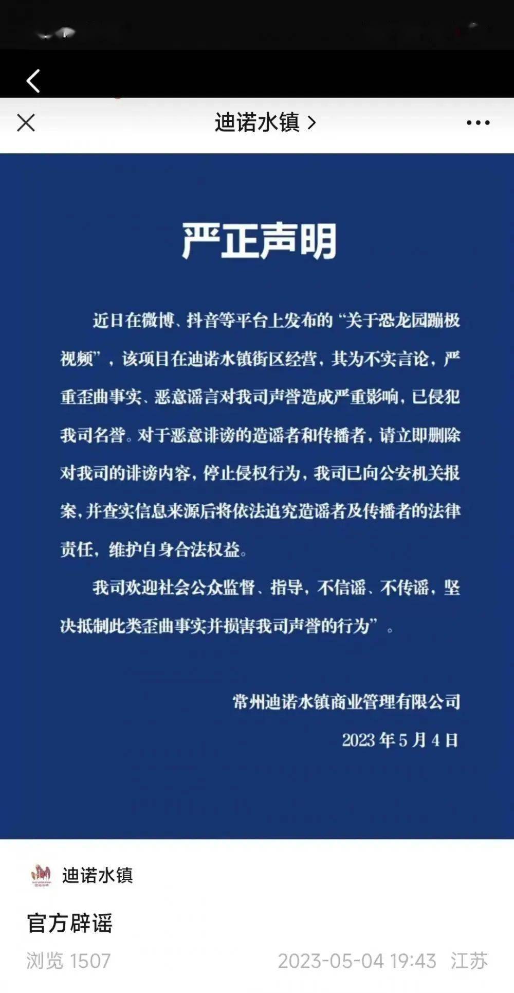 5月4日晚,艾酷极限蹦极俱乐部所处的“迪诺水镇”发布声明:“近日在微博、抖音等平台上发布的‘关于恐龙园蹦极视频’,该项目在迪诺水镇街区经营,其为不实言论,严重歪曲事实、恶意谣言对我司声誉造成严重影响,已侵犯我司名誉。 对于恶意诽谤的造谣者和传播者,请立即删除对我司的诽谤内容,停止侵权行为,我司已向公安机关报案,并查实信息来源后将依法追究造谣者及传播者的法律责任,维护自身合法权益。”