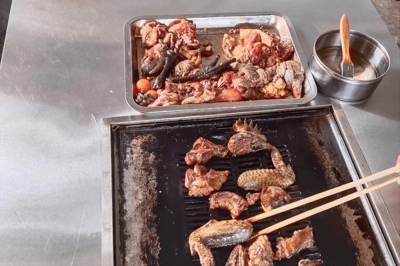 宁洱的这个朋友看到陈林一脸的懵,直言道,不是让你吃生的,这个鸡是老板提前腌制好了的,桌子打开就是一个无烟的烤炉,我们吃的时候,把鸡肉放入到烤炉中去烤,熟了之后,就可以吃了,这个需要自己烤一下的。
