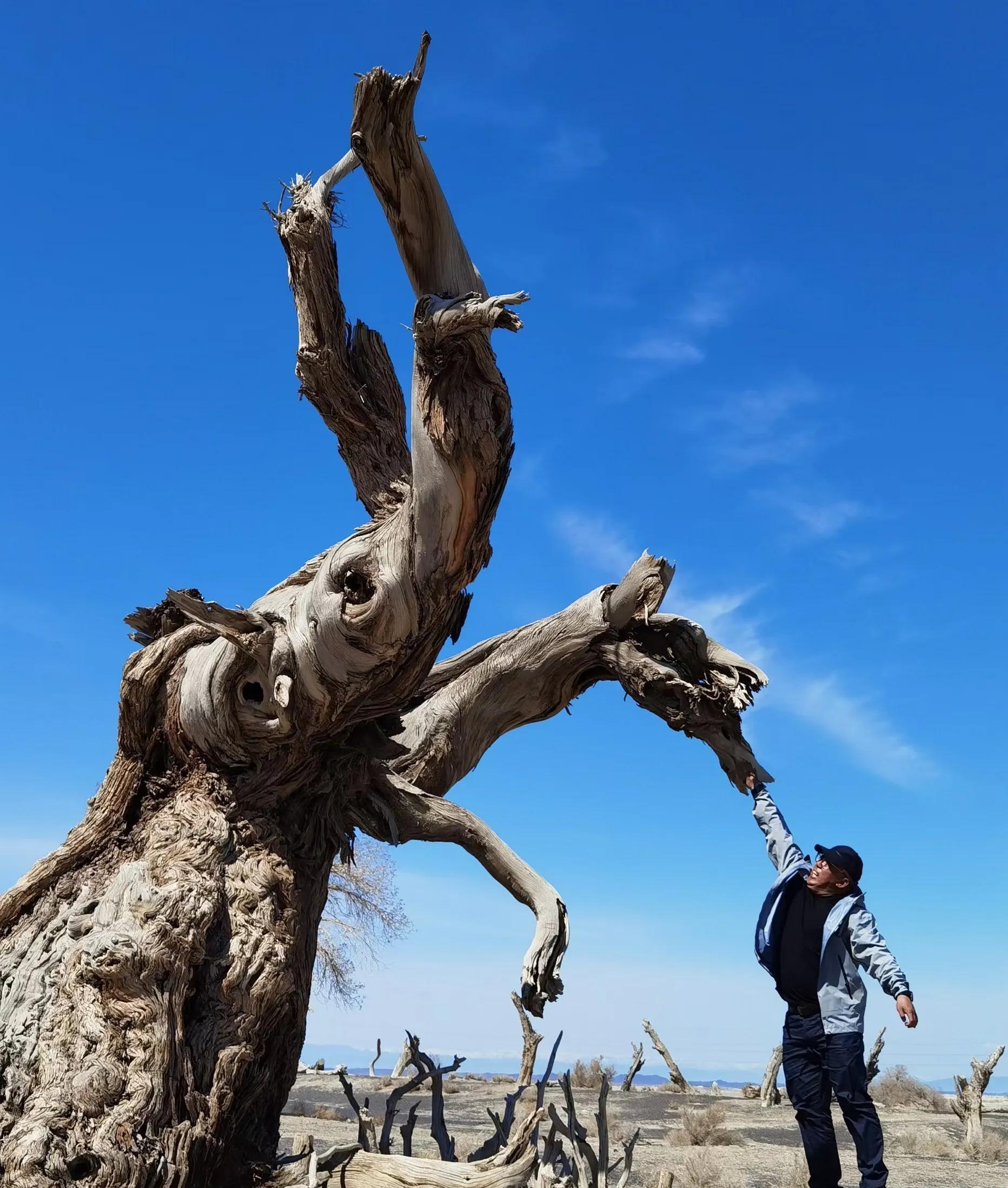 ▲ 考察踩线成员在乌尔禾景区胡杨上留影 。