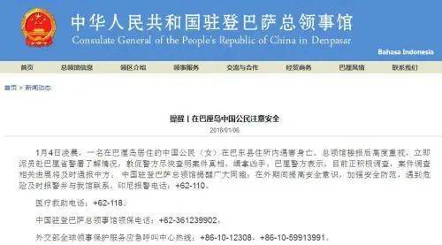 公告说,1月4日凌晨,一名在巴厘岛居住的中国公民(女)在其住所内遇害身亡。总领馆接报后高度重视,立即派员赴巴厘省警署了解情况,敦促警方尽快查明案件真相,缉拿凶手。