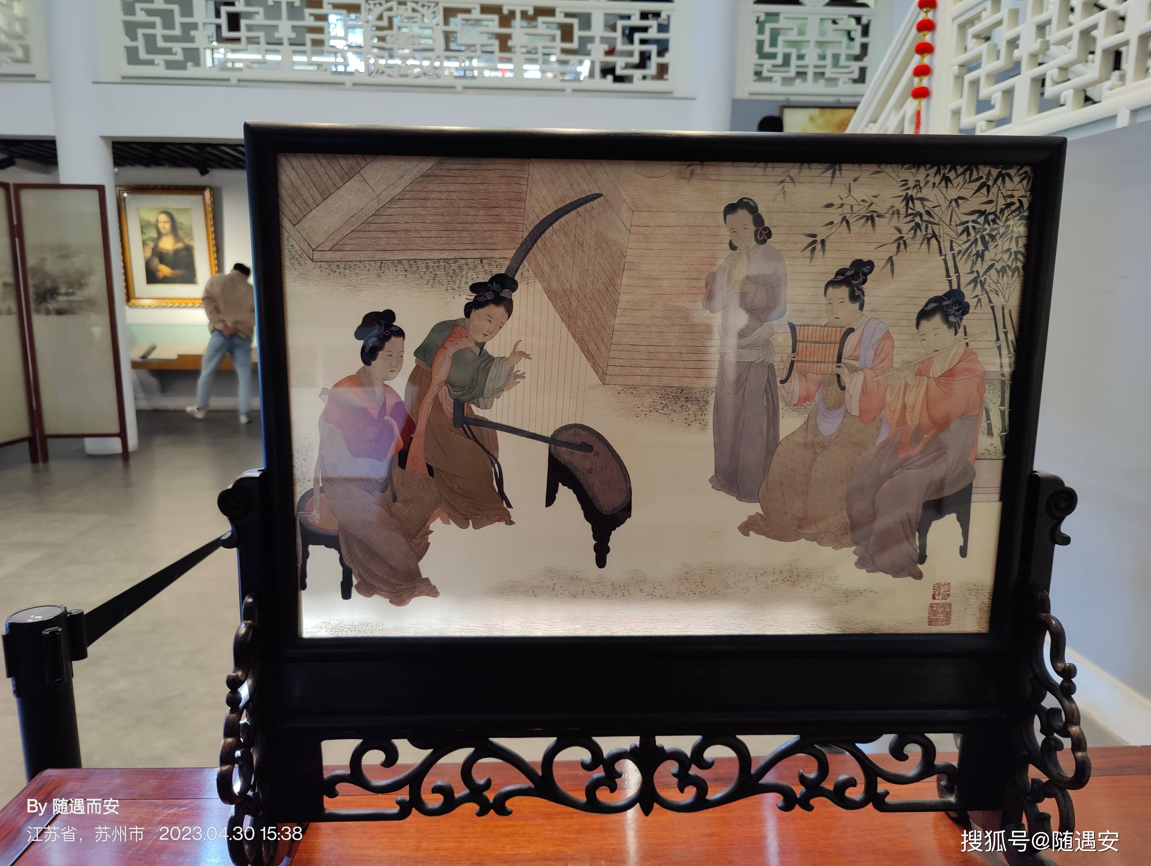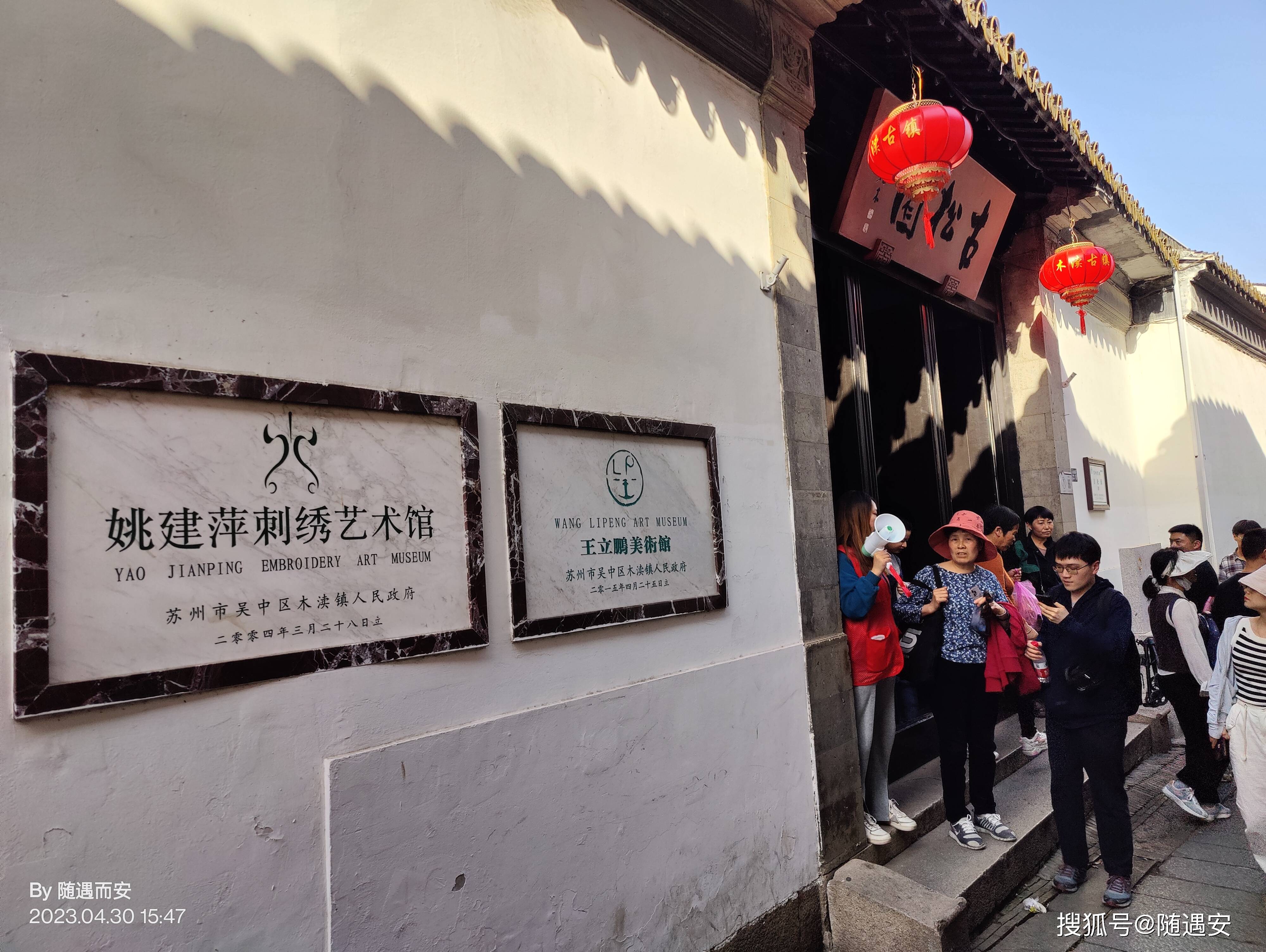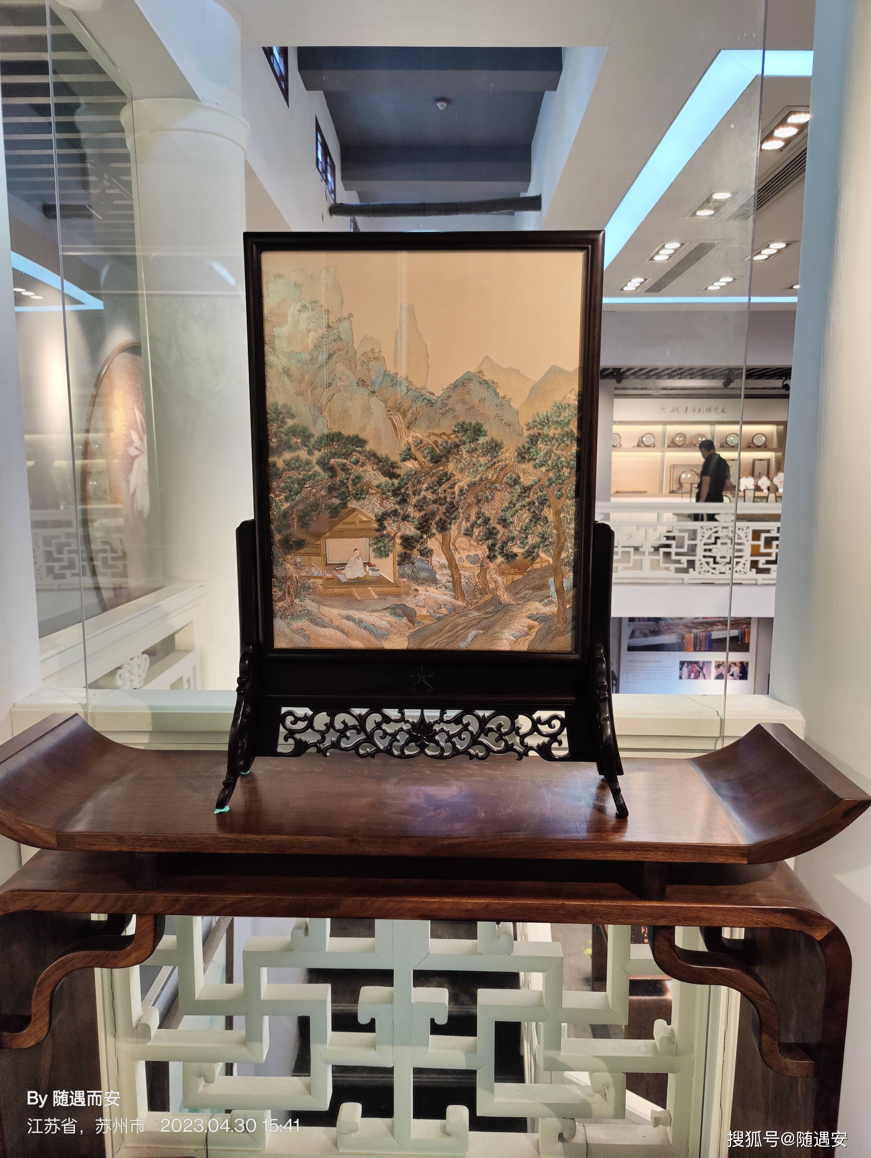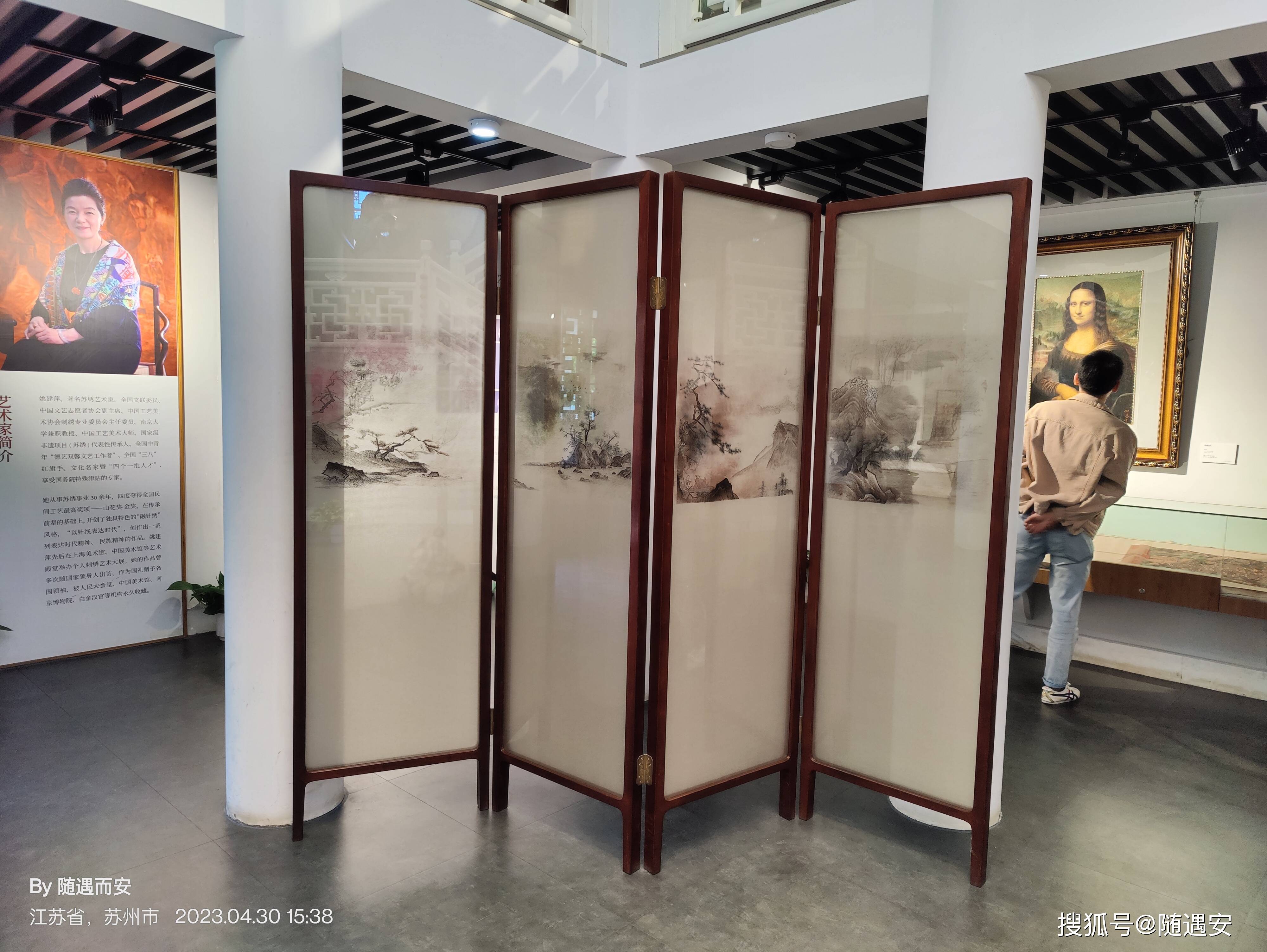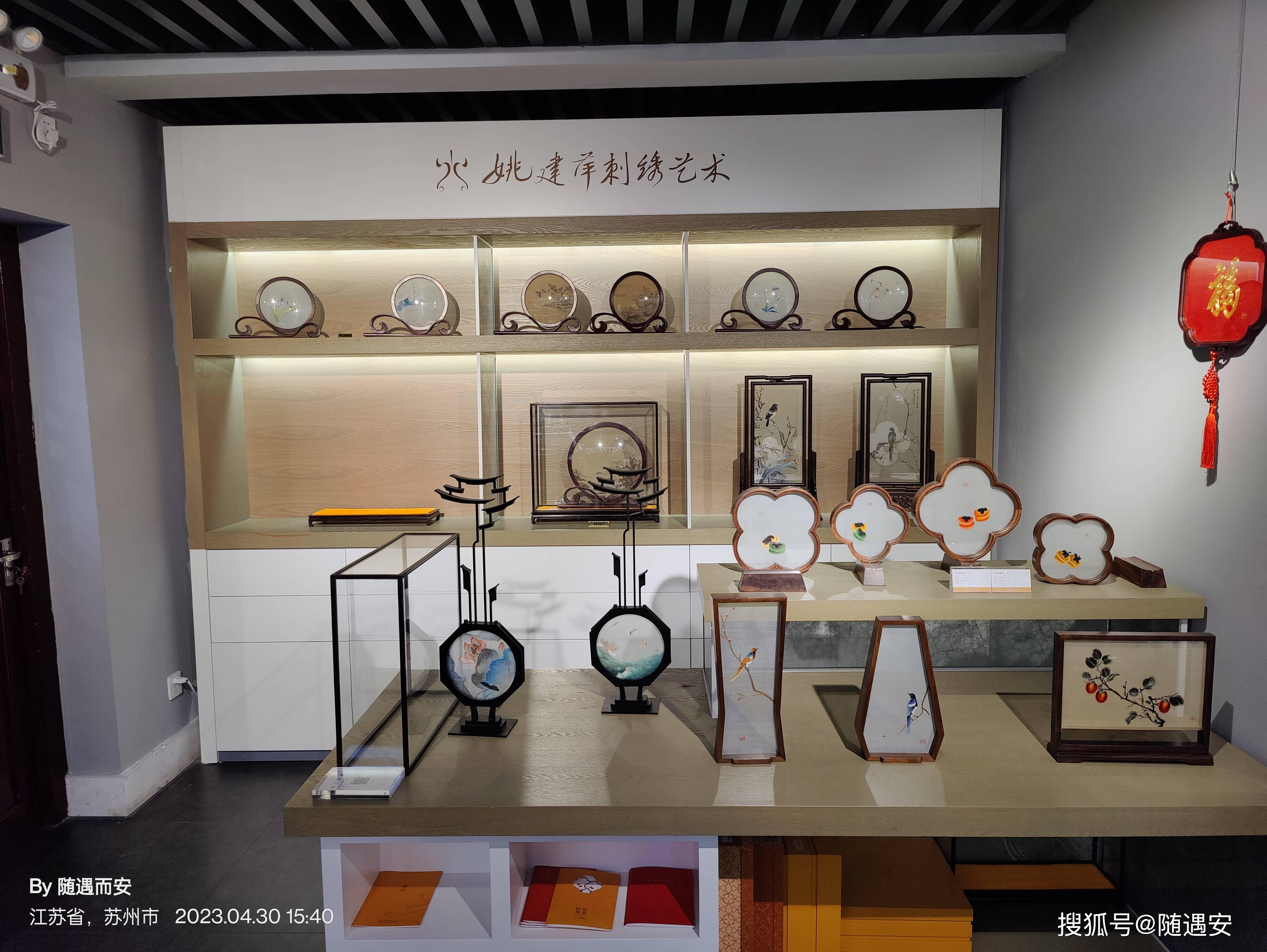 我们继续沿着长廊前行,来到姚建萍刺绣艺术馆。姚建萍是苏绣第三代传人,研究员级高级工艺美术师,国家级非物质文化遗产项目(苏绣)代表性传承人,被誉为“苏绣皇后”。联合国教科文组织授予“民间工艺美术大师”, 中国刺绣艺术大师。 这儿规模更为宏大。分为馆藏作品展示区和精品销售区域,内中陈列一百多幅姚氏刺绣精品。