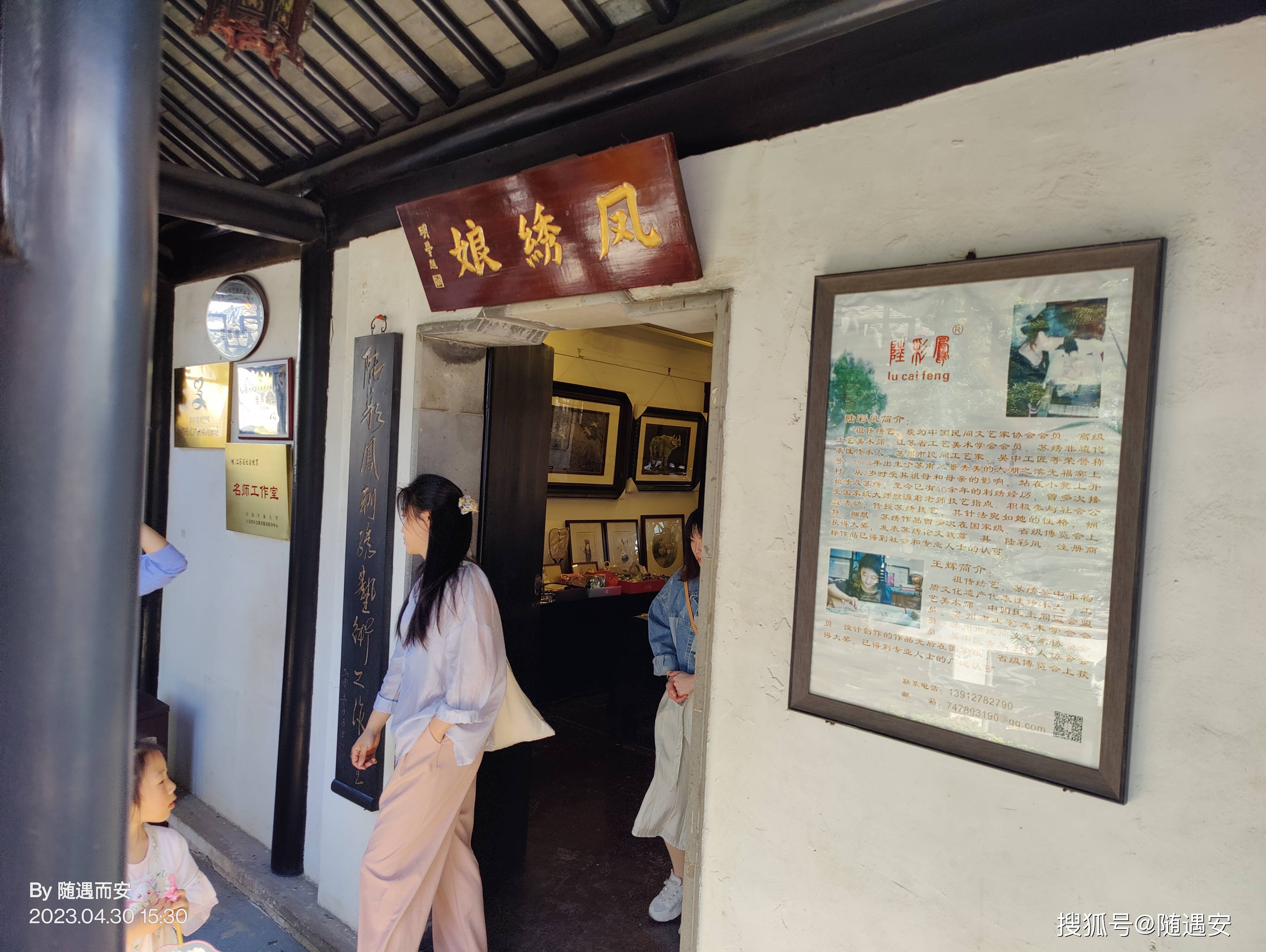 沿着双层长廊慢行,廊中有间陆彩凤刺绣艺术工作室,题匾“凤绣娘”。她是中国民间文艺家协会会员、高级工艺美术师,在苏绣行当里也是小有名气。工作室分里外两间,外间桌上和墙壁上,以及墙脚处,挂满和堆放着琳琅满目的苏绣作品。里间有绣架及接待来客的桌椅,1964年出生的陆彩凤将年满花甲,正静静地坐在屋角专注地做着手中的活。而满屋的作品给人如入宝室的感觉。