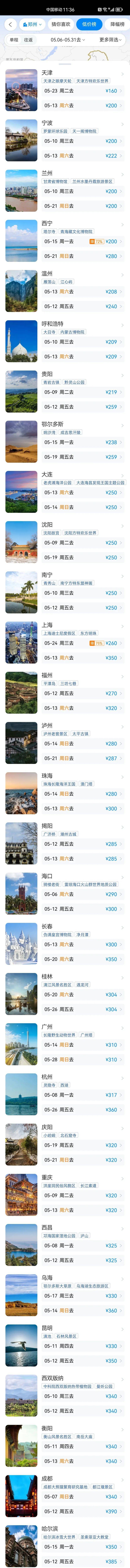 此外,大河报·豫视频记者在携程旅行App特价机票页面中看到,多地也已出现价格不过百的机票(不含税),如长沙-宜昌100元、天津-吕梁99元、呼和浩特-阿拉善左旗20元。而5月31日前,郑州直飞国内多地的价格也都降至500元以下,其中,郑州直飞天津最低160元;郑州直飞宁波、兰州、西宁最低200元;还有到福州、贵州、鄂尔多斯、大连、沈阳、南宁、上海、珠海、揭阳、海口、重庆、广州、桂林、昆明、成都等旅游城市,郑州直飞价格也不超过350元。