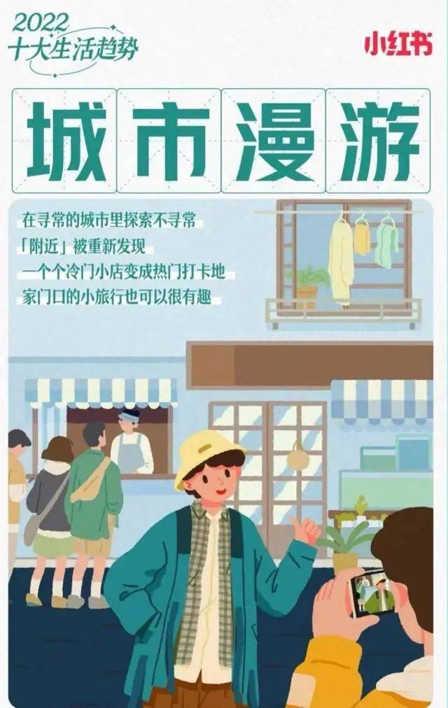 仅仅是 2021 年下半年,该社交平台上的“City Walk”相关笔记发布量就环比增长近 8 倍,而在小红书发布的《 2022 年十大生活趋势》中看到,“城市漫游”位列第五位。