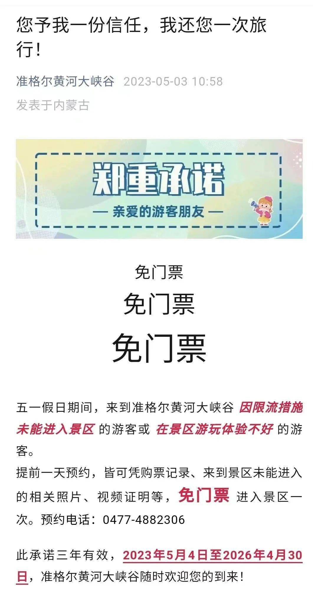 5月3日,来自准格尔黄河大峡谷景区公众号的一篇推文《您予我一份信任,我还您一次旅行》一经发出,迅速占据了游客的朋友圈,迎来点赞不断。