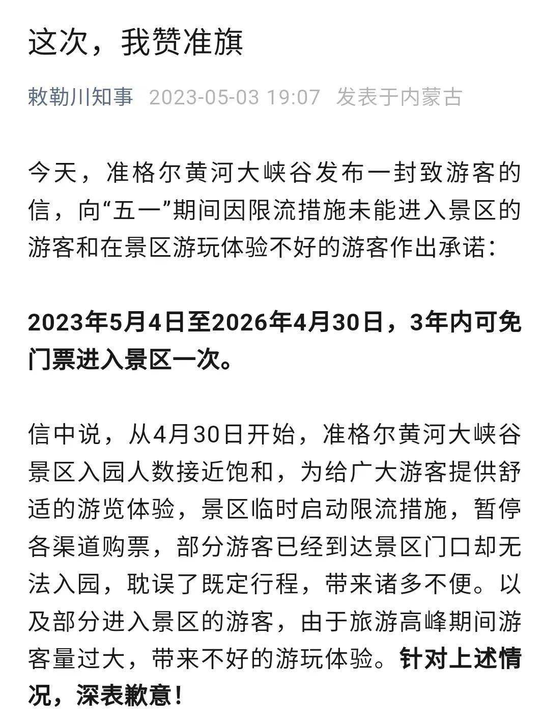 当日,“敕勒川知事”发表文章《这次,我赞准旗》,直言“真诚才是必杀技”,大赞景区将游客“当回事儿”的暖心举动,一天内,文章点击量近万,大批路人留言评论区,怒赞准格尔旗有底气、有格局、有温度。准格尔旗凭借真诚和温暖出圈。
