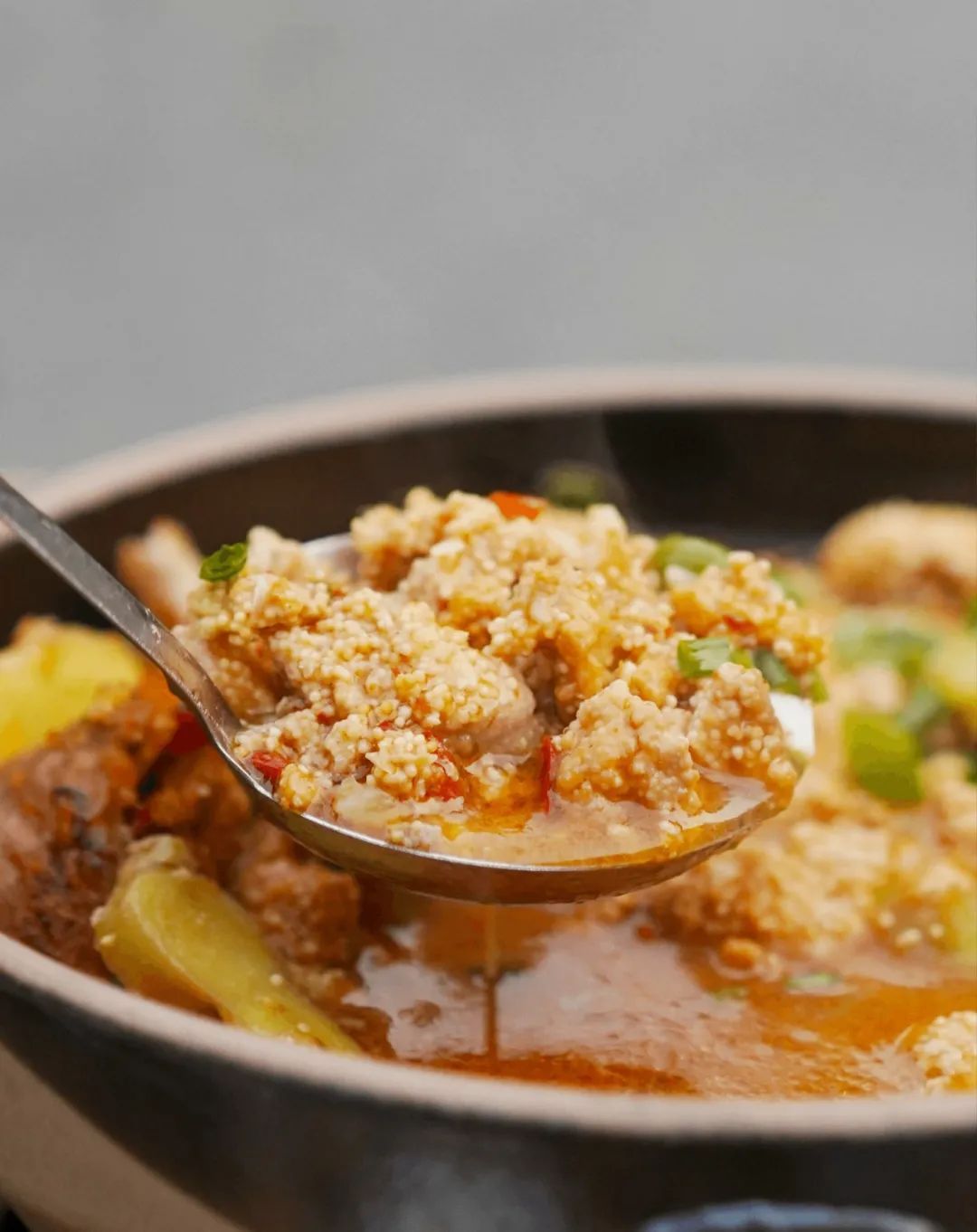 鱼钵子吃到最后,一定要加点醡辣椒来糊,这是整道菜的精髓。醡辣椒是用糯米磨粉,拌上剁辣椒、封坛、发酵而成,加清水拌匀后,浇入鱼汤底中形成糊,鱼的鲜、醡辣椒的咸、香、辣,拌饭可谓一绝。