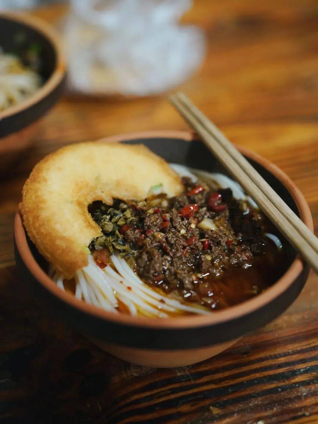 最受欢迎的码子有三种:原汤牛肉、干腌牛肉、酸辣牛肉,根据喜好可选汤粉或拌粉。湖南人称吃粉的动作为“嗦”,其实很形象,米粉连带着汤汁被吸入口中,香、弹、滑同时都被品尝到。吃汤粉的时候,还要配一个“穿眼粑粑”才算地道。这种用米浆、黄豆浆与小葱混合炸制的小吃,单吃酥脆,泡入米粉汤中,吸了汤汁与牛油变得酥软。