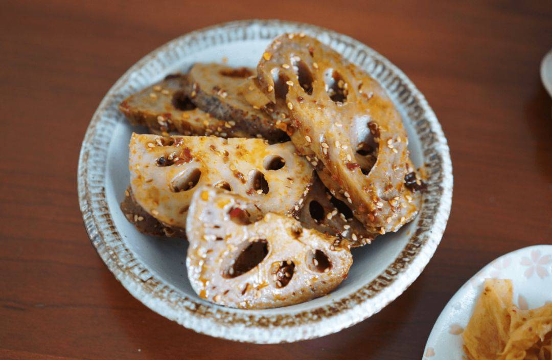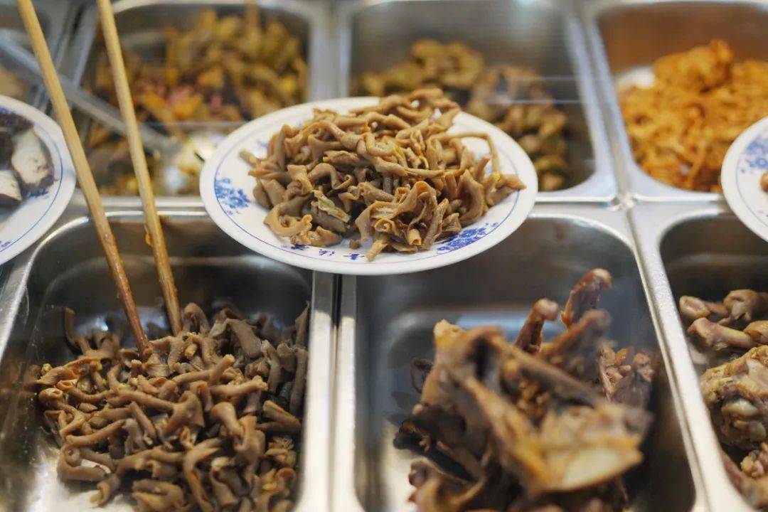 相比起酱板鸭,凉拌素菜也好吃。每年十月到来年五月是本地莲藕上市的时候,在卤水中煮熟切厚片,加红油拌匀即可食用,肥厚又粉糯。除了凉拌,还有“热卤”。卤味上桌前先在卤水中重新加热一遍,再加辣椒油和其他佐料拌匀。