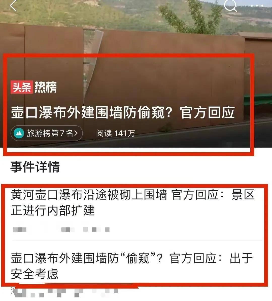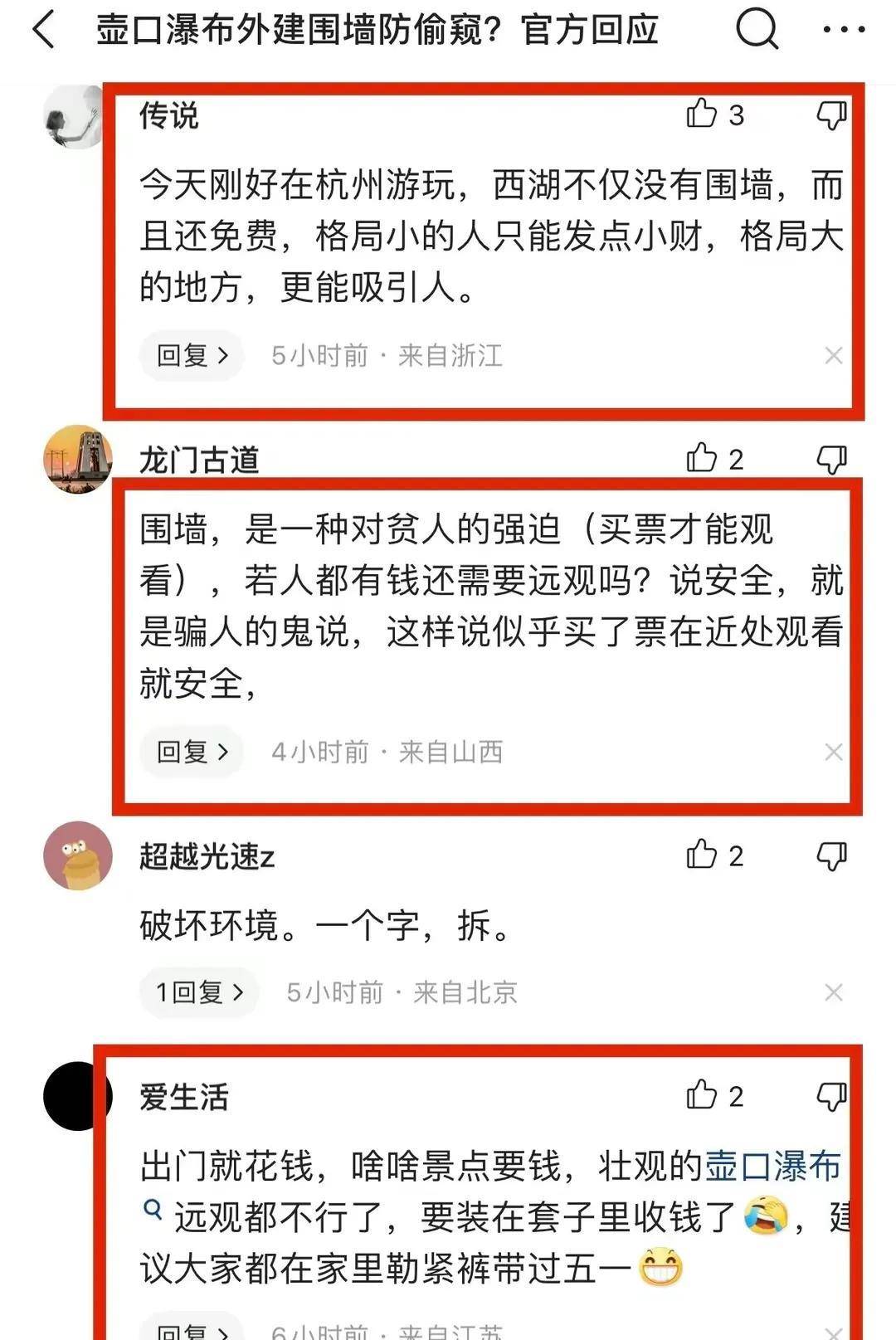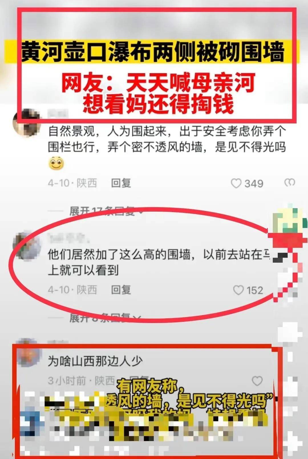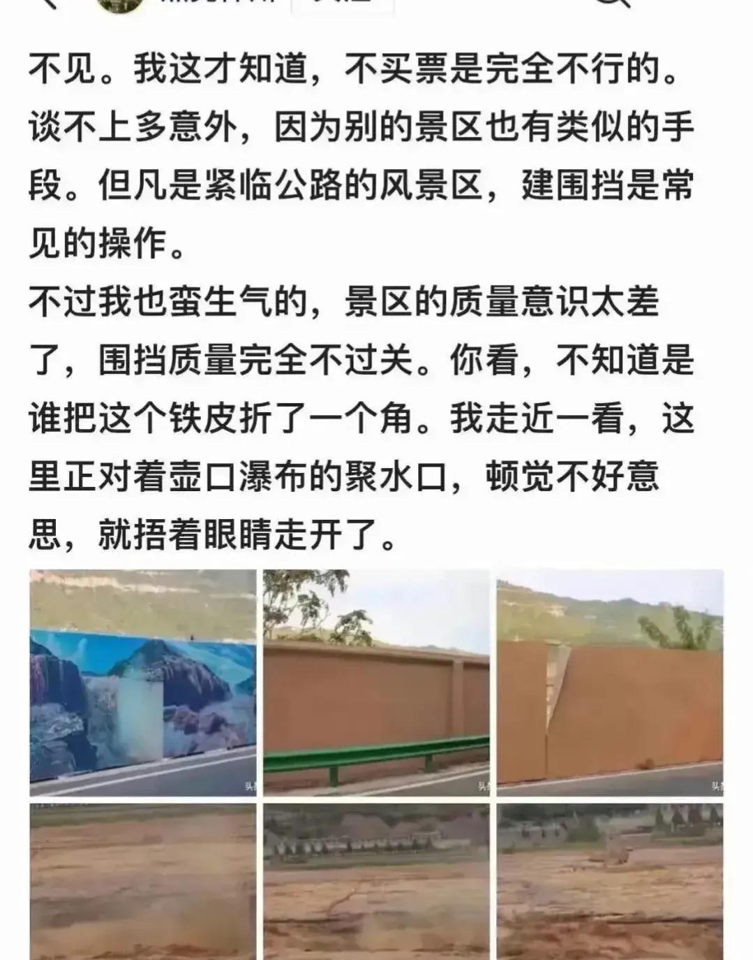 西湖放开后,旅游收入不降反升,你倒好?壶口瀑布砌墙?这就是差距!还不如给黄河修围墙,给长江安护栏,给渤海匟盖盖!砌围墙,收门票呢?不就是中国景点的一贯作风吗?如果再有钱的,那就砌大围墙,让游客坐大巴进去,每人再收五十块。杀鸡取卵,不如和南浔、西湖一样,干脆免费。只有免费的才是最贵。才能带动文旅市场。话说:壶口是河南陕西两个省的?问过十四亿华夏儿女了吗?三年前带妻子,丈母娘去过一次。观光车80/人,门票一百多/人。媳妇感觉观光车太贵,就退票了。我们开车一路前行,开到壶口瀑布上方(也就是砌围墙的那条路),从上往下俯视整个壶口瀑布,蔚为壮观,比进入平着视角看好看多了!