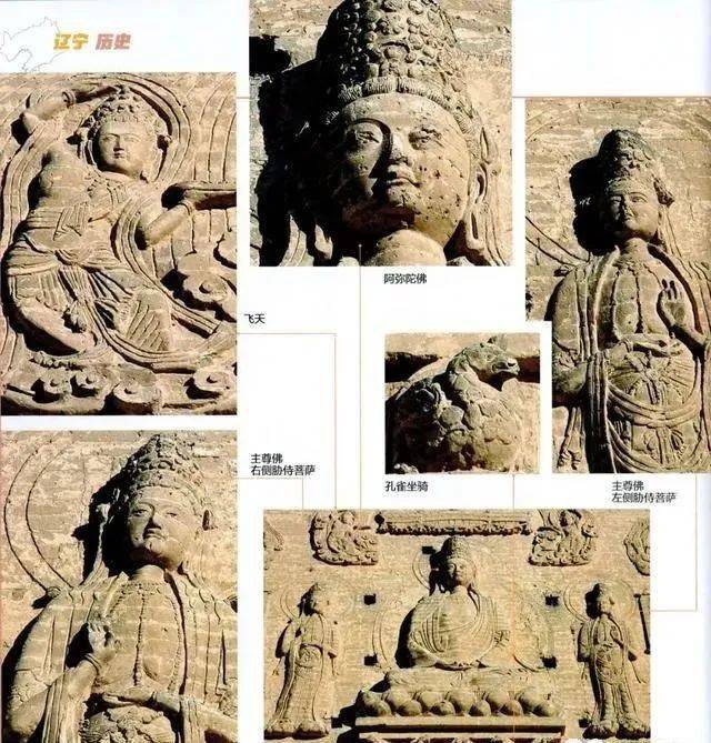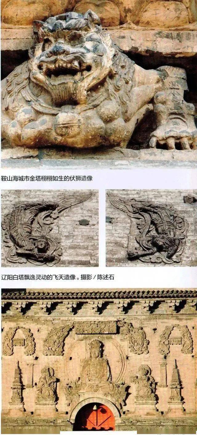 除了砖仿木构外,辽塔还以精美的砖雕技术闻名,比如高70.4米的辽宁第一高塔——辽阳白塔,胁侍菩萨砖雕精美异常,有曹衣出水之姿,其立姿飞天,素有辽塔第一飞天之美誉。海城市析木镇的金塔须弥座壸门内的八只伏狮,雕刻艺术令人叹为观止,为辽金动物雕刻艺术精品,历经千年,风采不减。朝阳凤凰山云接寺塔的塔身砖雕异常复杂,雕工细腻,宝相庄严栩栩如生,塔身还雕刻有众多的乐器和舞伎形象……透过一座座辽塔砖雕,我们不仅能看到千年前佛教的流布,也能感受到契丹民族乐舞文化的发达和日常生活的丰富。
