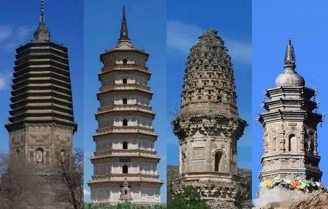 图8 辽塔四式(由左向右:密檐式、楼阁式、花塔、覆钵式)