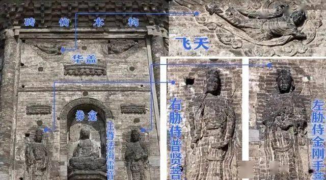 图12辽塔砖雕大体分为东西两个流派,西派主要分布在燕山以南和雁门关以北地区,塔身表面以门窗为主题。东派则以佛教造像浮雕为主题,这一流派除极少数的几座,全部分布在辽宁省。密檐式辽塔的第一层塔身各面几乎全为“一主尊二胁侍三华盖二飞天、主尊趺坐于券龛中”的布局,是辽宁辽塔的标准造型。图为锦州广济寺塔第一层塔身正西面。
