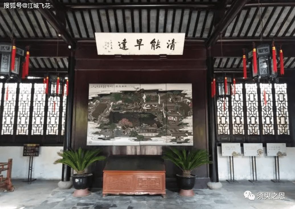 东部住宅部分前后四进,从正门入口进去是轿厅。这是旧时停放轿子的地方,所以今天还放了一个几百公斤的红木轿子供人参观。轿厅有一屏风,绘着网师园全图,屏风上挂了一块“清能早达”的匾额。这四个字如果解释为清廉能干、早年发达之意,似乎与园主的志趣相悖,因为王维还有“白首相知犹按剑,朱门早达笑弹冠“之句。