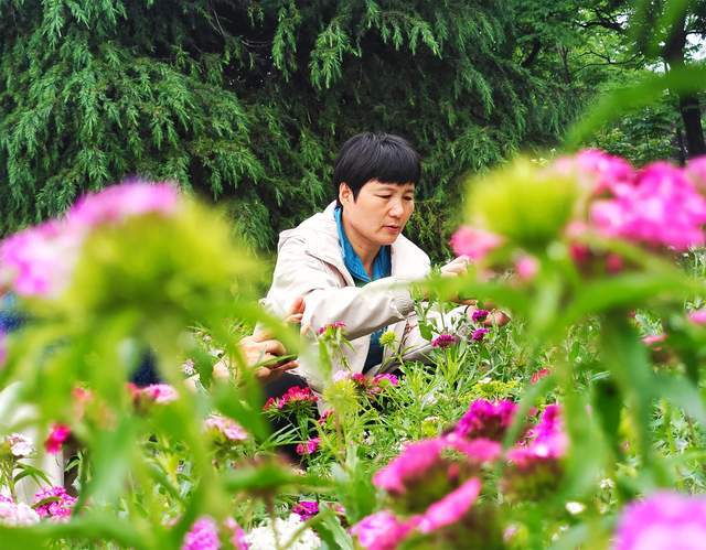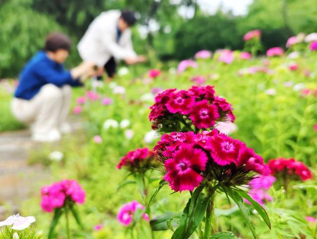 近日,山东郯城县马头镇文化广场绿化园内,一片片石竹花开烂漫,绚丽多姿,吸引了过路行人拍照留影。