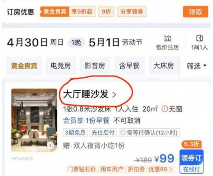 获悉,涉事酒店为台州帕瑞思酒店,由于“五一”假期酒店客房火爆,所以将酒店大堂的沙发利用起来,推出“99元睡沙发”的住宿产品。“99元大厅睡沙发”床型只在发布当天限量发售,目前已经下架。
