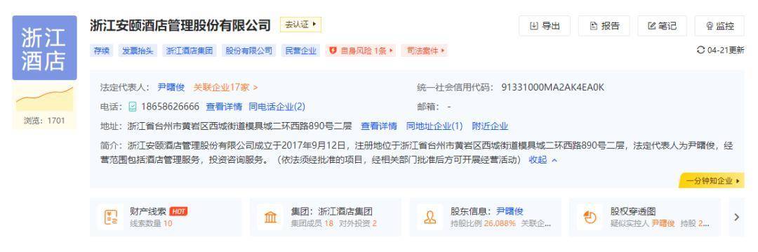 根据启信宝APP数据显示,台州帕瑞思酒店隶属于浙江安颐酒店管理股份有限公司,成立于2017年9月12日,注册地位于浙江省台州市,法定代表人为尹曙俊,经营范围包括酒店管理服务,投资咨询服务。