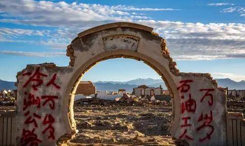 现在的冷湖没有了当年的烟火气,曾经的欢笑声也成了过往,到现在只剩下很多不完整的墙,很多墙上还有着当时人们写的标语。