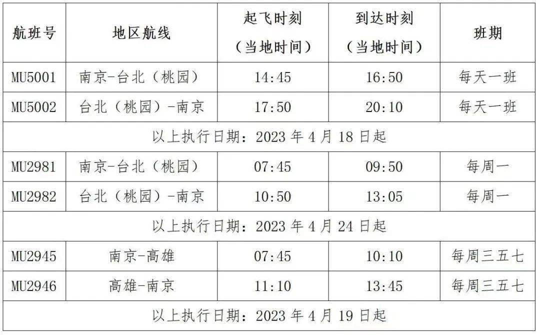 4月18日至4月23日,南京往返台北每天一班。南京-台北出发航班为MU5001,计划于14:45从南京禄口国际机场起飞,当地时间16:50抵达台北桃园机场;回程航班为MU5002,计划于当地时间17:50从台北桃园机场起飞,20:10抵达南京禄口国际机场。