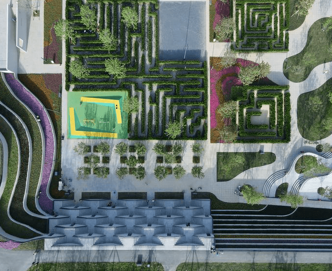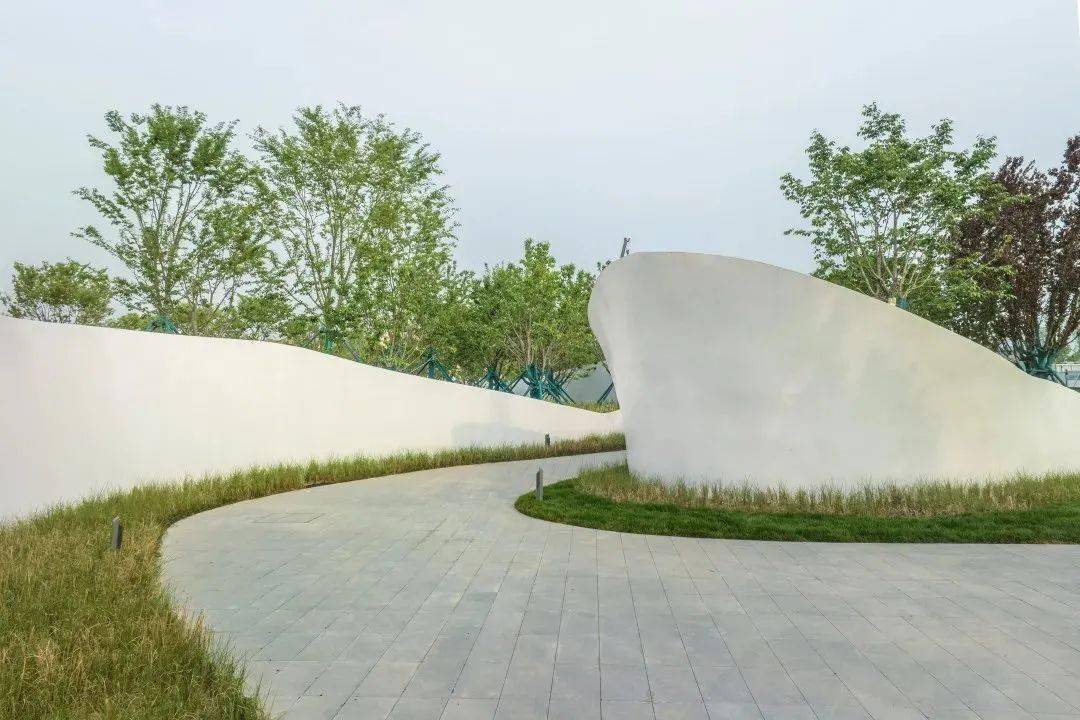中央公园以未来之瞳大剧院建筑线条语言为基础的景观空间形式,从西到东设置四个功能区,通过设置不同类型的游憩、活动场地及跑道,将整个公园连接起来,形成有机的整体。