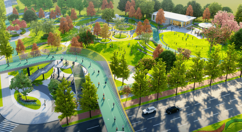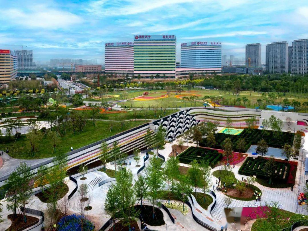位于未来之瞳西北侧长康路与顺康路之间,分为运动休闲、商务社交、下沉空间等功能区,用地面积约51.8亩,是未来之瞳东西轴线上重要的带状景观空间。