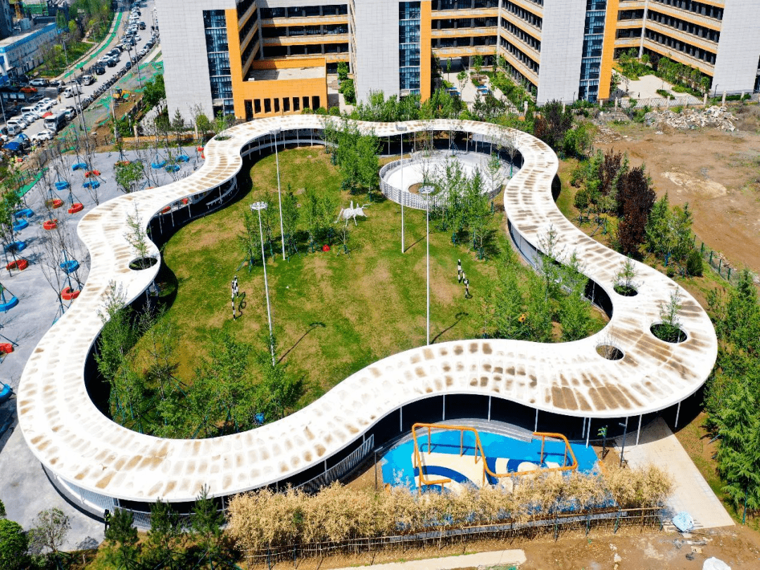 公园与市政停车场的相融合,拥有波浪球场、环形廊架、儿童沙坑、休闲驿站等配套设施,设置了大量的趣味科普题材设施,寓教于乐,在绿色的休闲空间里为孩子打开了知识之门。