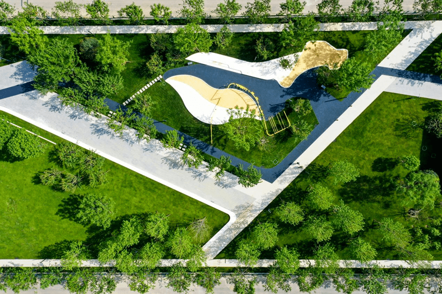 西侧运动休闲区面积约13.8亩,设置有儿童乐园、慢跑道、瑜伽草坪和林下活动绿地,能够满足全龄段人群的各种活动需求,并设置城市驿站为市民提供服务。