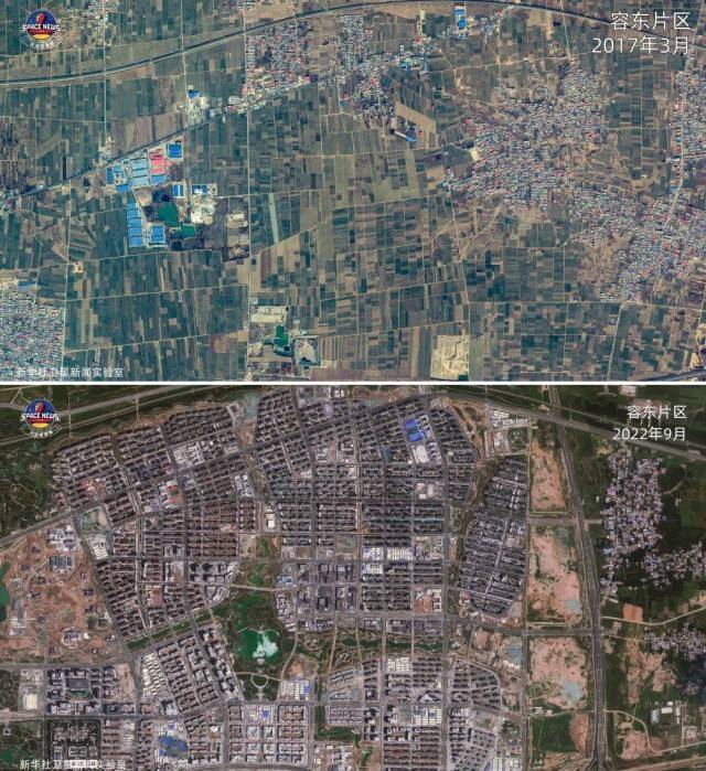 拼版照片:上图为2017年3月的雄安新区容东片区卫星图;下图为2022年9月的雄安新区容东片区卫星图。