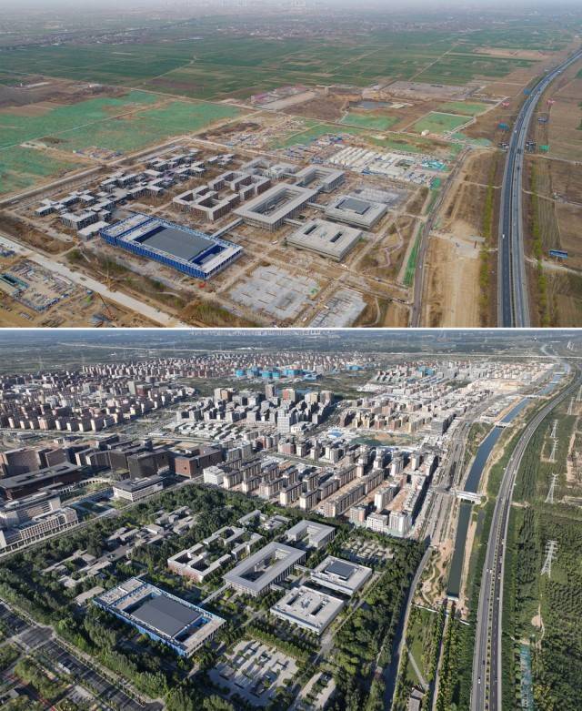 拼版照片:上图为2018年3月29日拍摄的雄安市民服务中心(无人机照片);下图为2022年9月6日拍摄的雄安市民服务中心(无人机照片)。