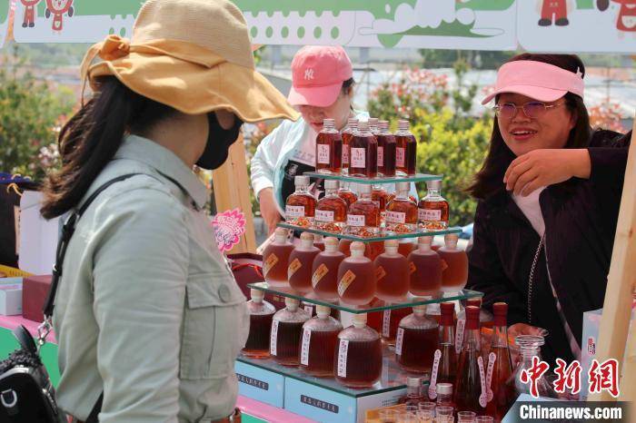 现场展销的樱桃酒吸引游客驻足。 蔡亚群 摄