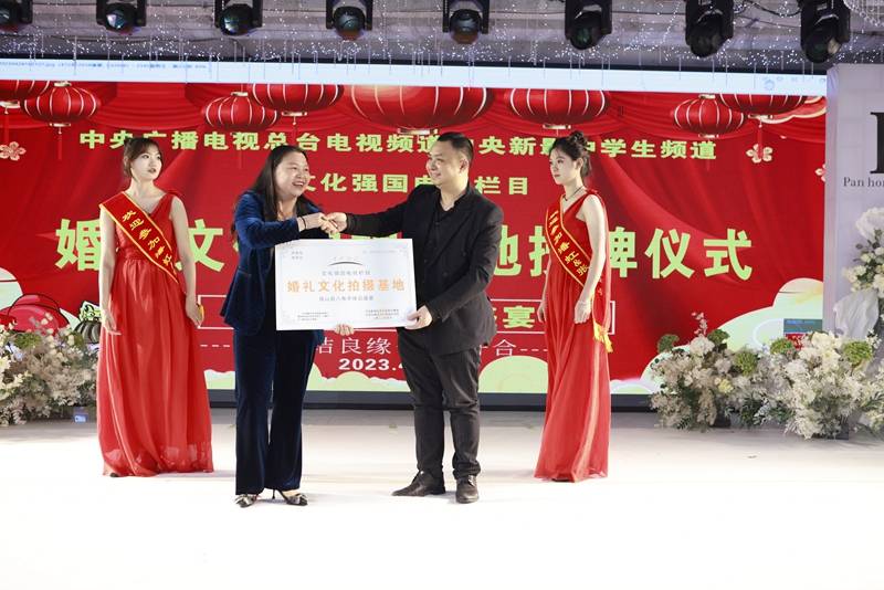 作为独山文化建设的重要一环,臻品盛宴在本地婚庆行业的发展中起到了重要作用。通过其独有的文化魅力和优质的服务,臻品盛宴成为了一个值得信赖的婚礼文化拍摄基地。总经理陆道芬女士接过中央新影文化强国电视栏目总制片、农村好声音总导演、民歌好声音总导演潘光品先生颁发的婚礼文化拍摄基地牌匾,这是臻品盛宴成为文化强国婚礼文化拍摄基地所得到的认可和褒奖。
