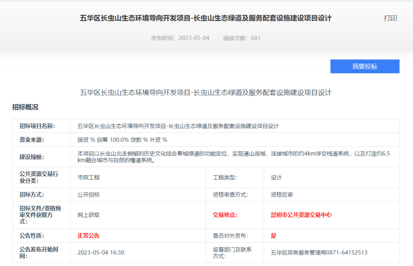 近日,昆明市五华区国有资产投资经营管理有限公司发布《五华区长虫山生态环境导向开发项目——长虫山生态绿道及服务配套设施建设项目设计》招标公告。