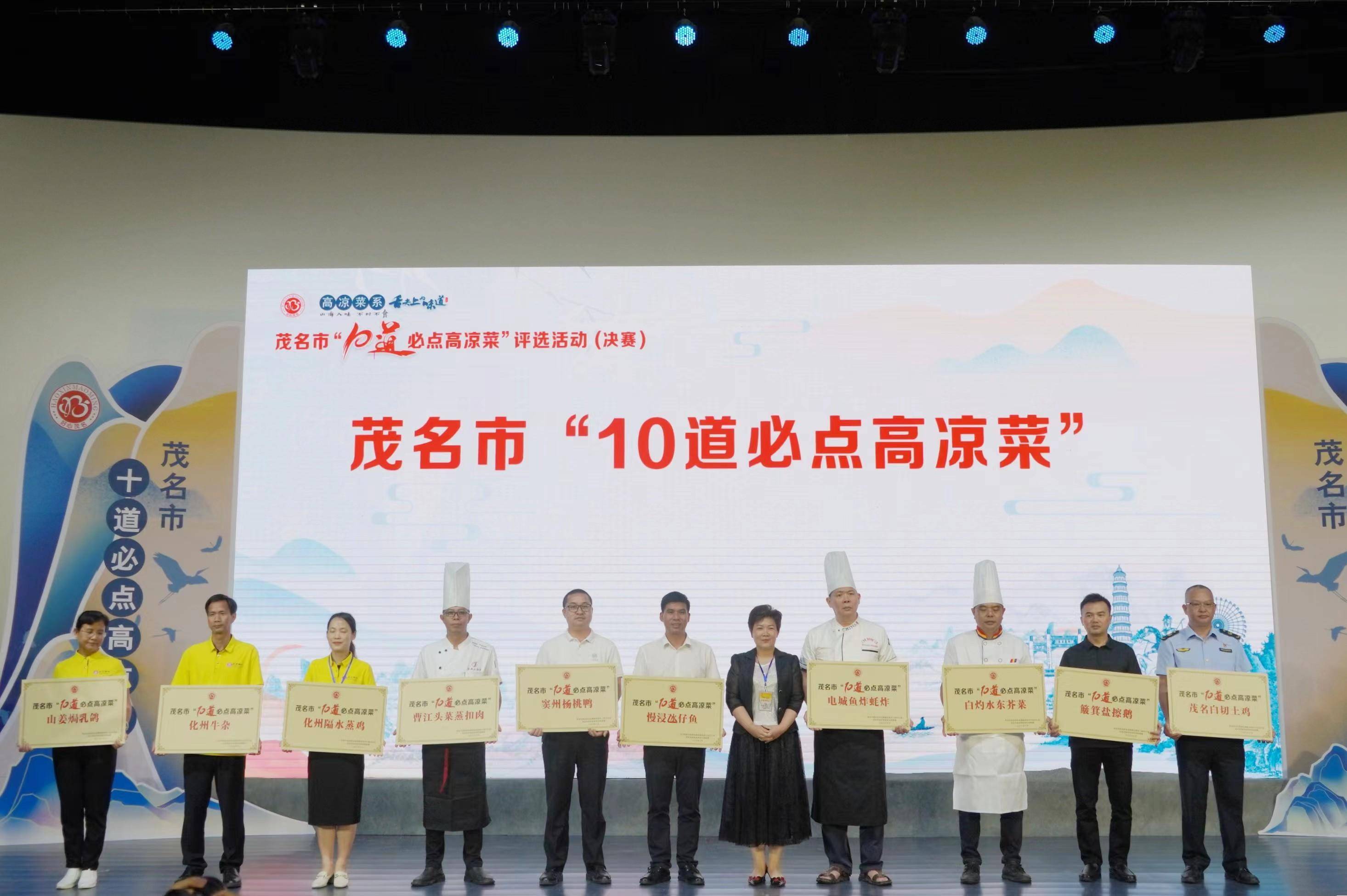 经过激烈的角逐,最终茂名白切土鸡、簸箕盐擦鹅 、白灼水东芥菜、电城鱼炸蚝炸、窦州杨桃鸭、慢浸氹仔鱼、曹江头菜蒸扣肉、化州隔水蒸鸡、化州牛杂、山姜焗乳鸽等获得茂名市“10道必点高凉菜”称号。