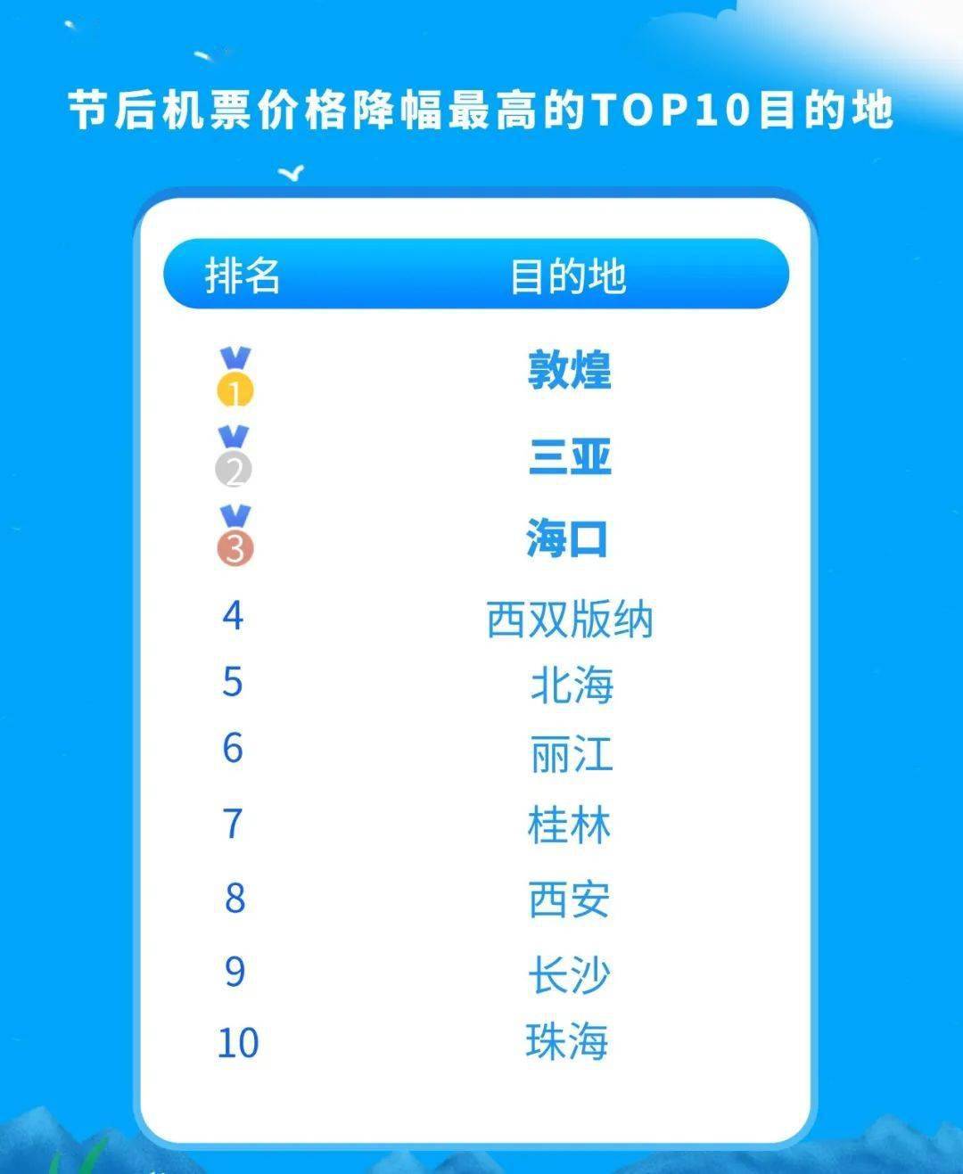 旅游属性较强的目的地,这一波价格降幅也更为明显。数据显示,五一后机票价格降幅最高的TOP10目的地为:敦煌、三亚、海口、西双版纳、北海、丽江、桂林、西安、长沙、珠海。其中,敦煌五一期间票价达到1427元,节后两周均价只需要668元;三亚节中票价1499元、节后两周759元。