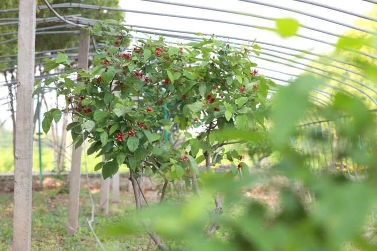 资源圃中,另一种夏季蜡梅“美国蜡梅”也在开花期。寻味而去,红色的花朵掩映在绿叶之间,有的含苞待放,有的随风盛开,娇艳欲滴。